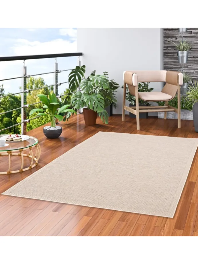 „Allrounder“ können Sie hier wörtlich nehmen! Dieser Teppich fügt sich nicht nur stilvoll in jeden Wohnbereich ein, sondern ist außerdem In- und Outdoor einsetzbar und setzt stilvolle Akzente in Natur Optik. Seine rustikale Sisaloptik passt „drinnen wie draußen“ und die erstklassige Kunstfaser hebt die Empfindlichkeit des Sisals auf und macht den Teppich robust und pflegeleicht. Das Material ist besonders strapazierfähig und hält sowohl Feuchtigkeit oder UV-Strahlung problemlos stand. Verschiedene Farben und Designs machen ihn an jedem Ort zu einem Hingucker! Das hochwertige Garn aus 100% Polypropylen ist schadstoffgeprüft. Die Herstellung der Ottawa Teppiche findet in einem nach BSCI (Business Social Compliance Initiative) zertifiziertem Betrieb statt.