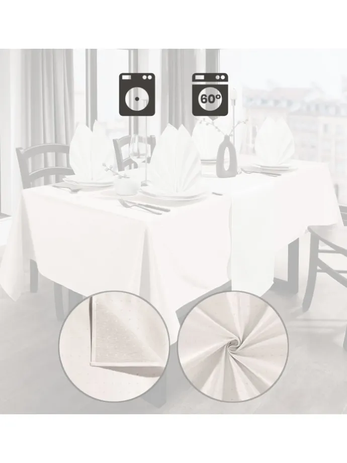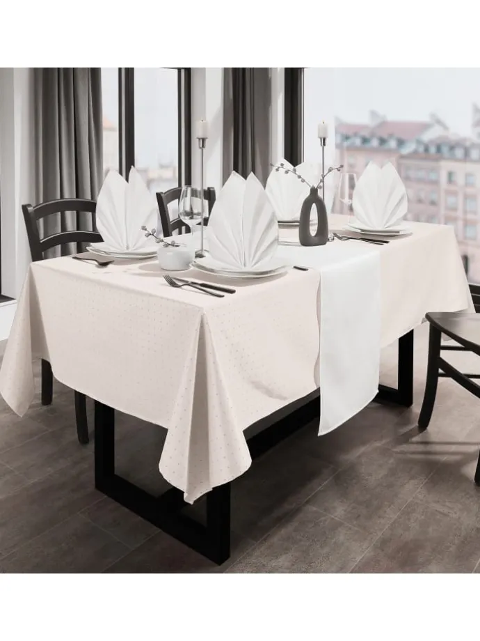REDBEST Tischdecke „Alcona“. Die stilvolle Serie mit dezentem Punktemuster verleiht Ihrem Esstisch eine besondere Note. Gefertigt aus hochwertigem Jacquardgewebe vereint sie zeitlose Eleganz mit praktischem Alltagsnutzen. Ideal für festliche Anlässe oder den sorgfältig gedeckten Alltagstisch.