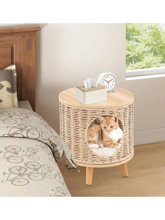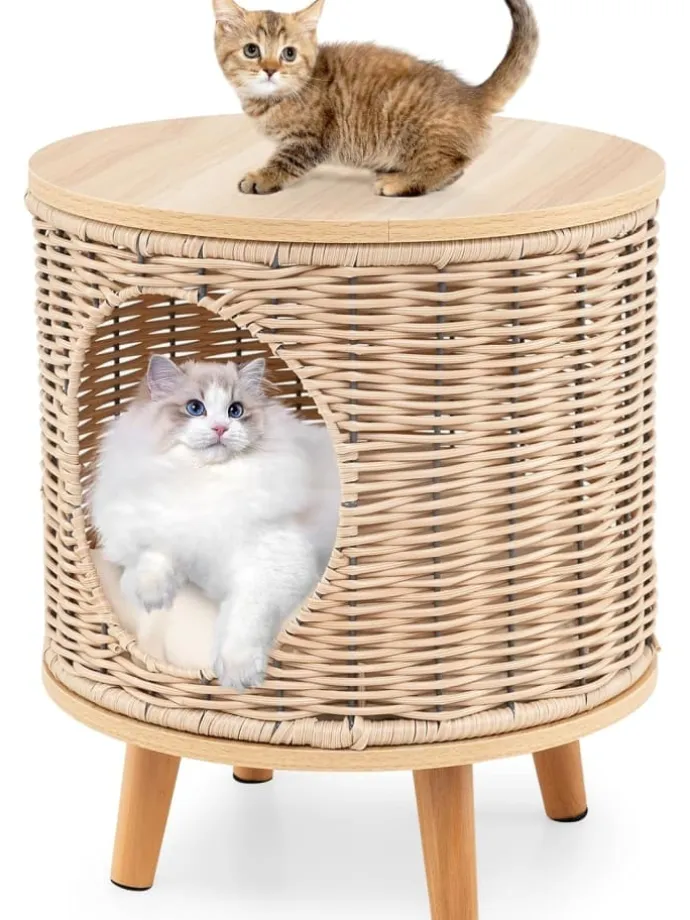 Dieses Katzenhausbett ist ein Premium-Rückzugsort für Haustiere! Unser Katzenhausbett kann eine perfekte Kombination aus Stil und Funktionalität darstellen. Hergestellt aus hochwertigem künstlichem Rattan, kombiniert es eine natürliche Ästhetik mit Haltbarkeit, ist sowohl reißfest als auch wetterfest. Die atmungsaktiven Seitenwände und das weiche, abnehmbare Kissen sorgen für den ultimativen Komfort Ihrer Katze. Vielseitig einsetzbar, dient es als Katzenstreu-Box oder Fußstütze und fügt sich nahtlos in jeden Raum ein. Sein stabiler Rahmen mit soliden Gummibaumholzbeinen und rutschfesten Pads garantiert Sicherheit. Die Montage ist schnell und einfach, und die Pflege ist unkompliziert, mit einer abwischbaren MDF-Oberseite. Schenken Sie Ihrem Stubentiger das gemütliche, sichere Zuhause, das er verdient.