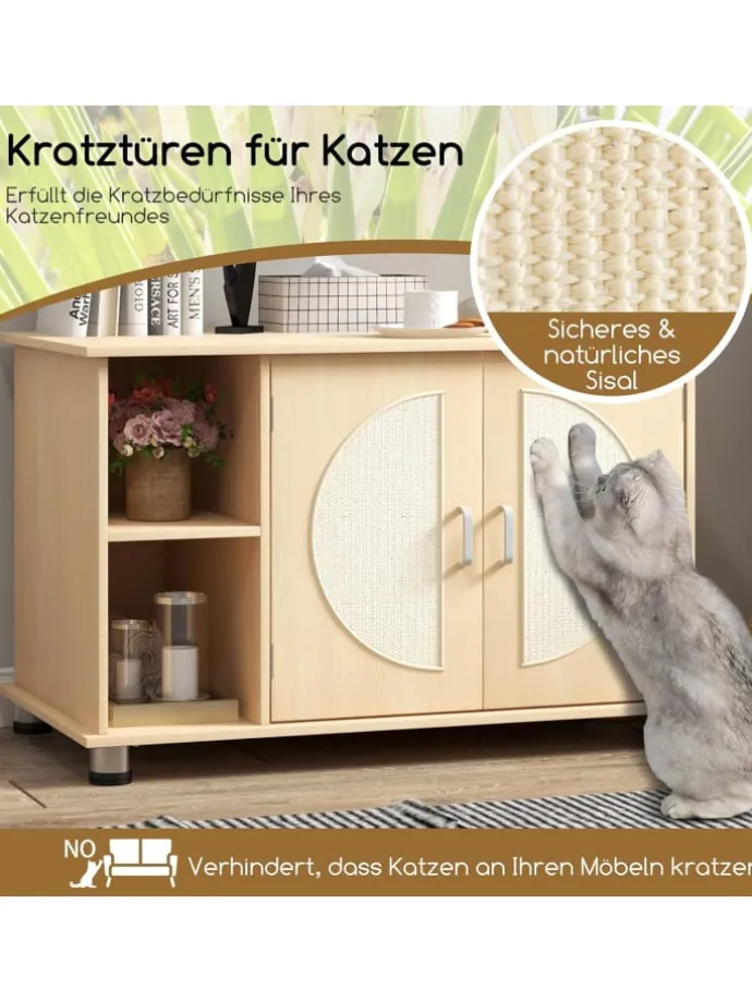 Unser Katzentoilettengehäuse zeichnet sich durch ein natürliches und elegantes Aussehen aus und eignet sich nicht nur als praktischer Schrank zum Verstecken von Katzentoiletten, sondern ist auch eine perfekte Ergänzung für Ihre Inneneinrichtung. Dieses Katzenhaus ist mit doppelten Sisal-Kratztüren ausgestattet und bietet einen speziellen Platz, um die Kratzbedürfnisse von Katzen zu befriedigen.
