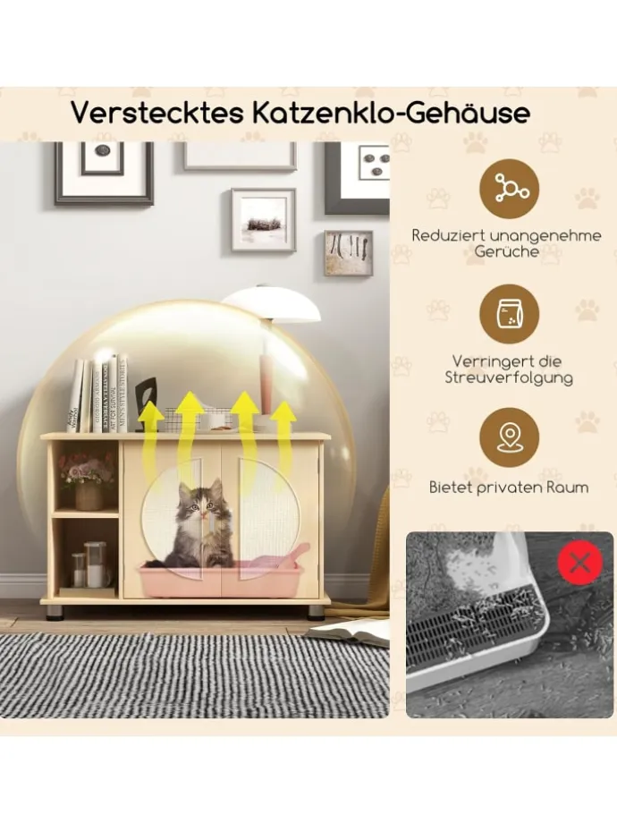 Der versteckte Bereich bietet Privatsphäre, reduziert die Verbreitung von Katzenstreu und unangenehme Gerüche