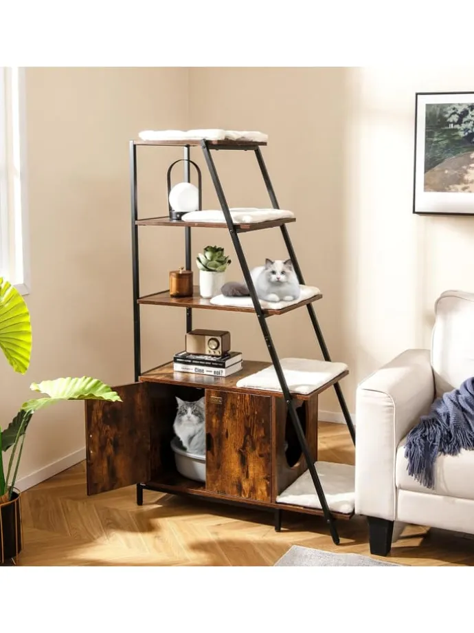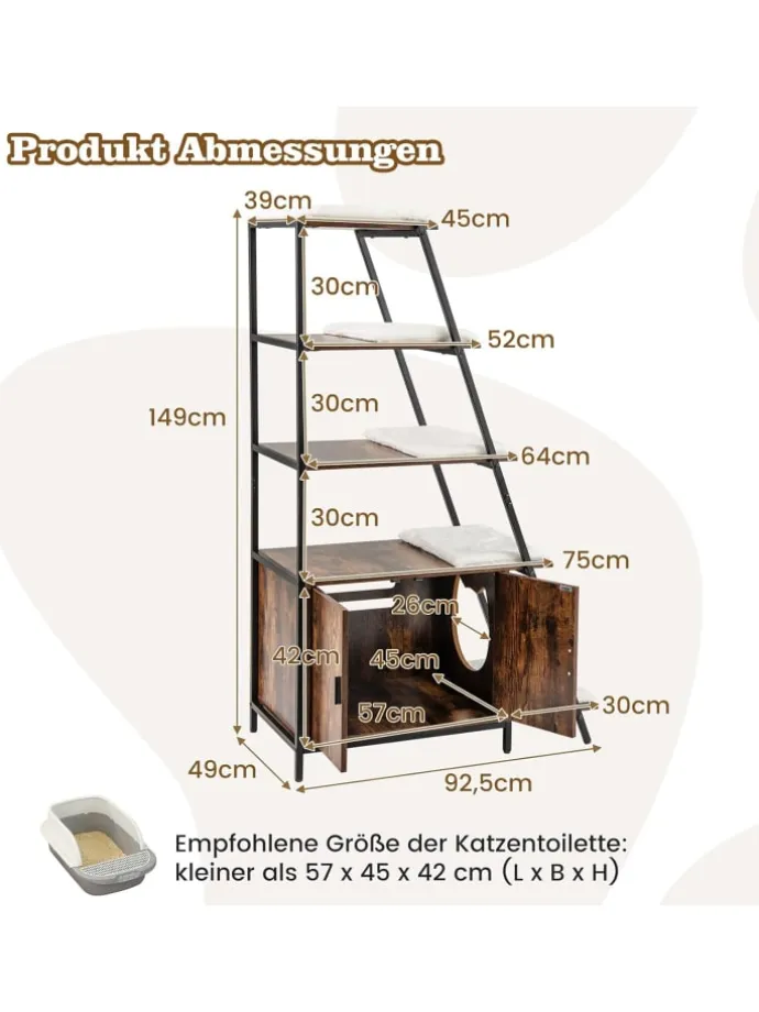 Der Schrank bietet Ihrem Kätzchen einen geräumigen und versteckten Rückzugsort und sorgt gleichzeitig dafür, dass die Streu vollständig aufgefangen wird. Mit Belüftungslöchern und seitlichem Eingang verspricht dieses Haustiermöbel, dass Gerüche von ihrem Wohnraum ferngehalten werden. Gleichzeitig bietet das funktionale 5-stufige Regalsystem vielseitige Ablageflächen. Darüber hinaus dienen die Leiterregale als Sprungplattformen, die Katzen erkunden können. Mit 5 abnehmbaren und maschinenwaschbaren Matten bietet der versteckte Katzenschrank gemütliche und saubere Ruheplätze, die Ihre Katzen lieben werden.