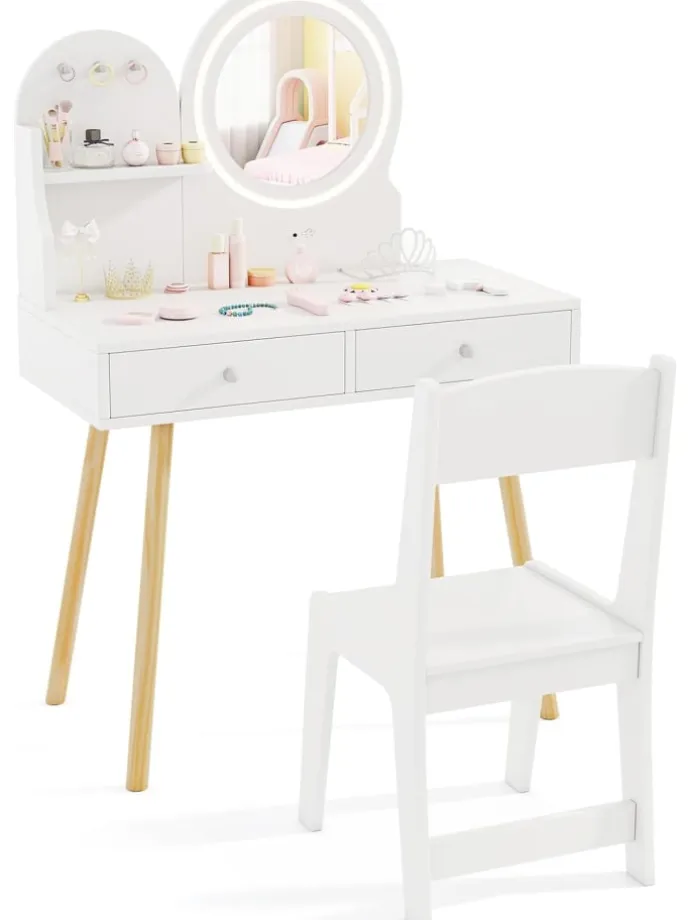 Verschönern Sie die Spielzeit Ihres Kindes mit diesem beleuchteten Frisiertisch und Stuhl.