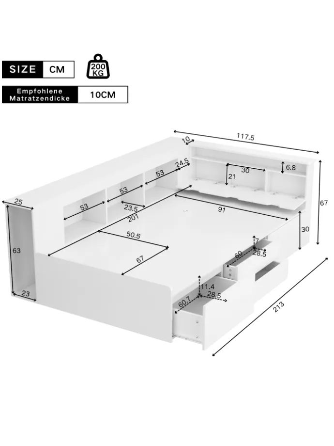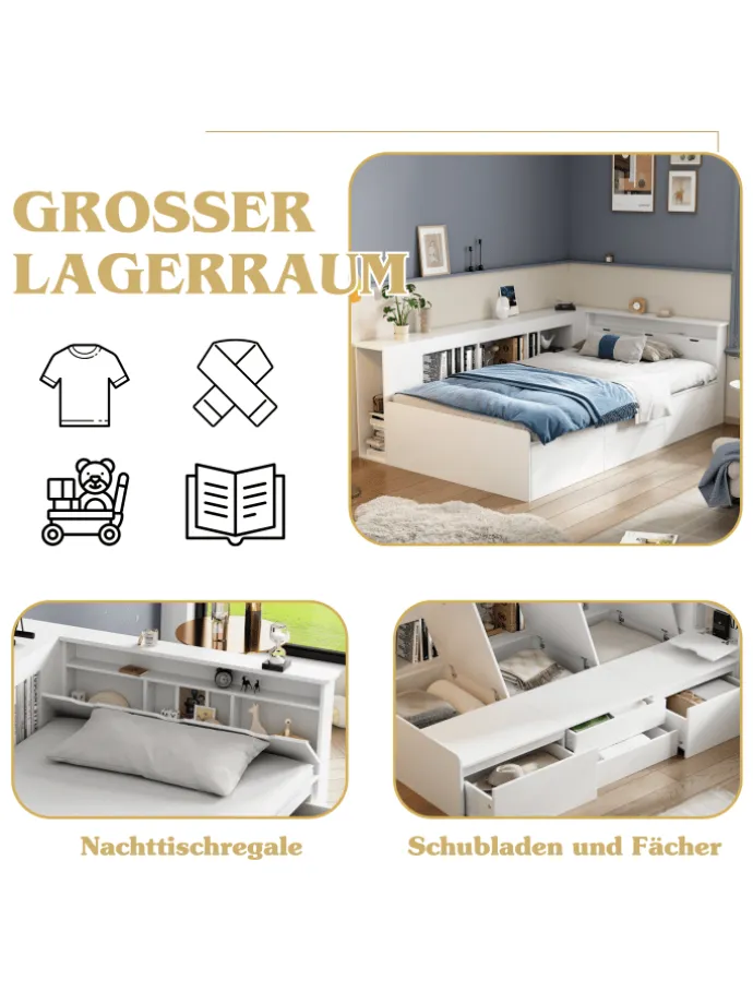Der Bettkasten verfügt über 3 versteckte Stauräume und ein Staufach am Ende des Bettes, das zusätzliche Aufbewahrungsmöglichkeiten bietet.