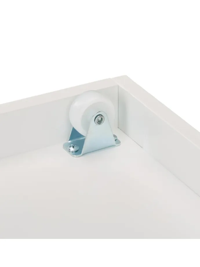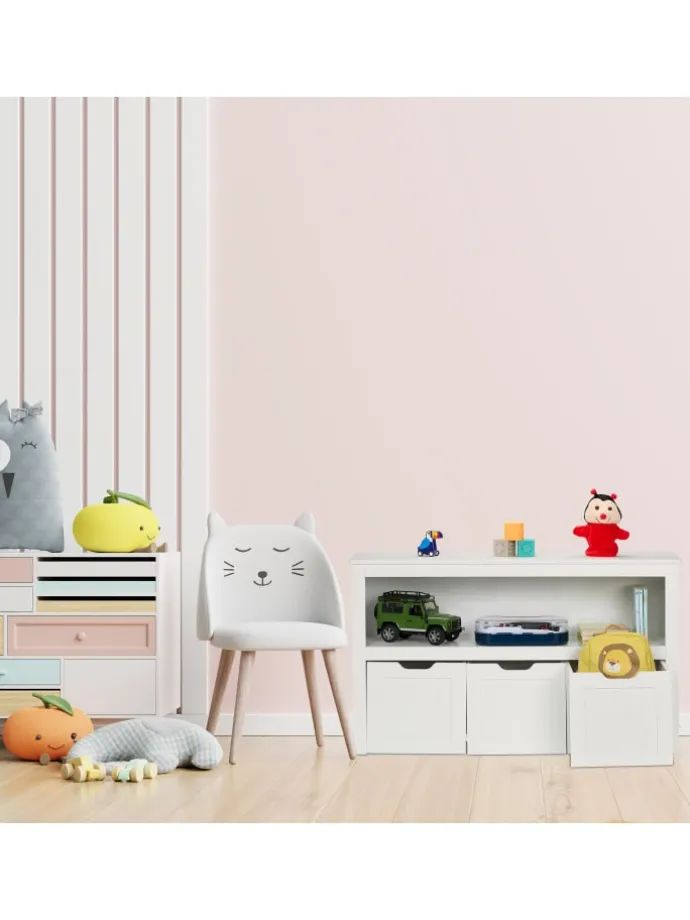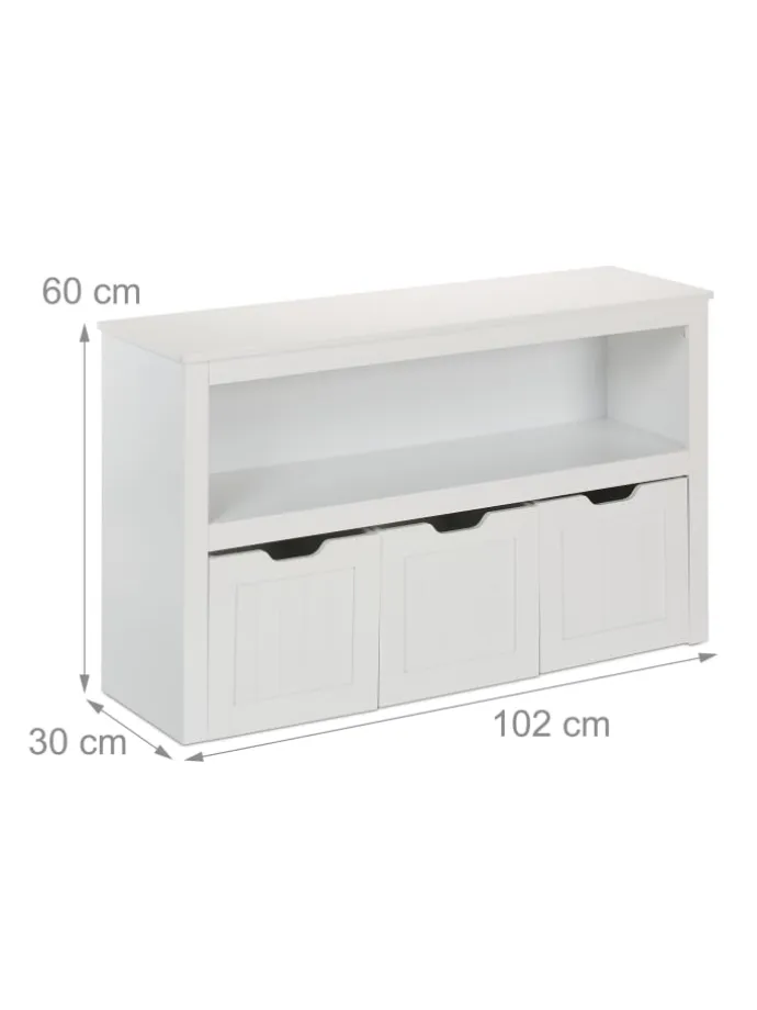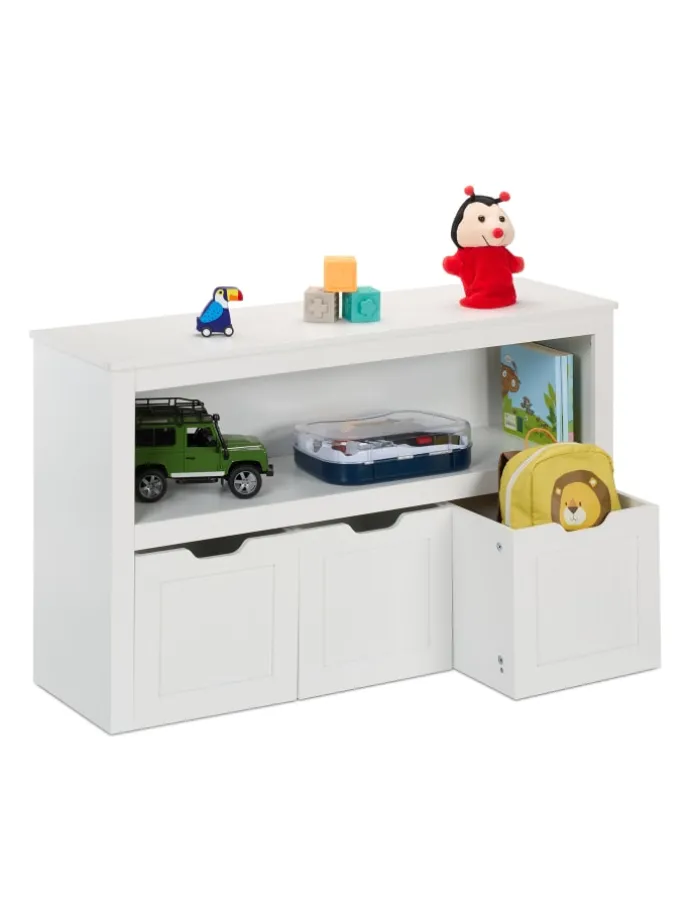 Die Kinderkommode eignet sich ideal zur Spielzeugaufbewahrung. Mit 2 Ablagen und 3 Aufbewahrungsboxen steht ausreichend Platz zur Verfügung, um Kuscheltiere, Bücher und Spielsachen ordentlich zu verstauen. Die Boxen sind mit Rollen ausgestattet und lassen sich leicht herausziehen, sodass bereits Kleinkinder das stabile Aufbewahrungsregal selbstständig aus- und einräumen können. Das Spielzeugregal in dezentem Weiß fügt sich harmonisch in das Kinderzimmer von Mädchen oder Jungen ein.