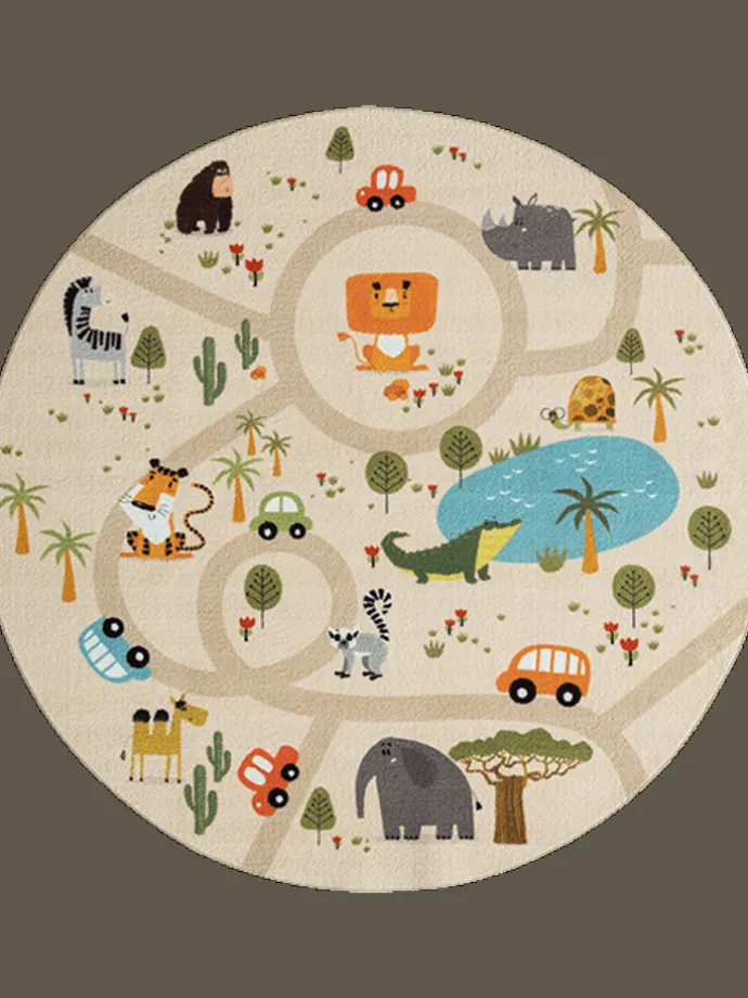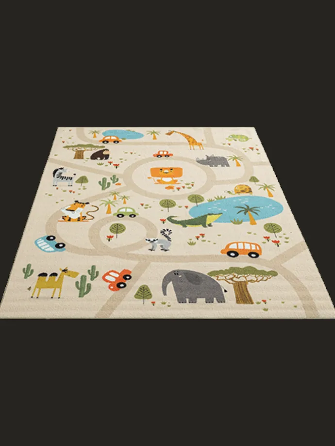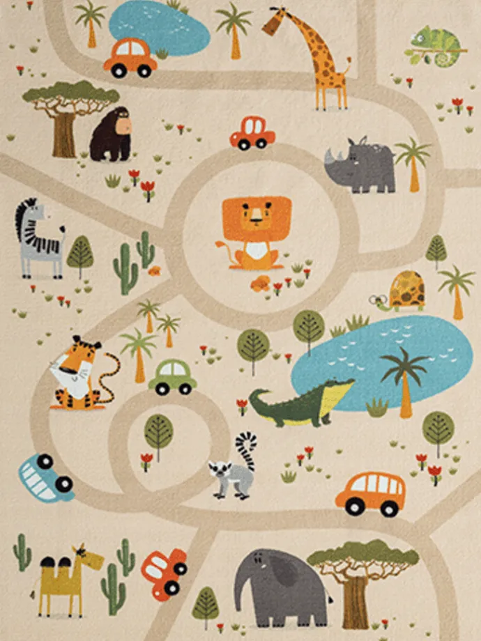 BUNT UND KINDGERECHT: Spielteppich mit Safari-Motiv in den Grundfarben Beige, Grün oder Grau