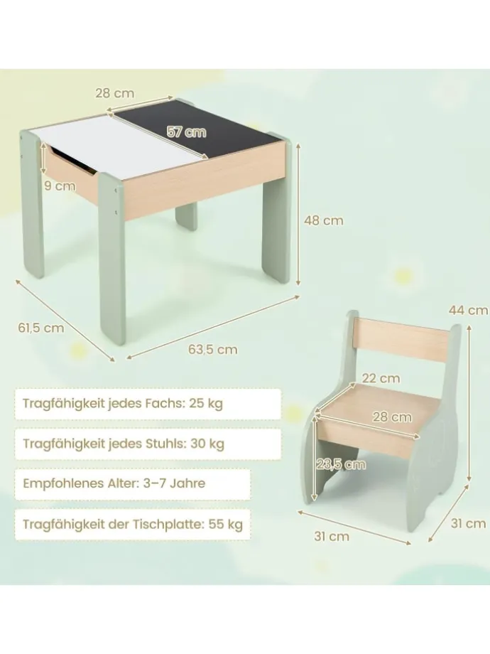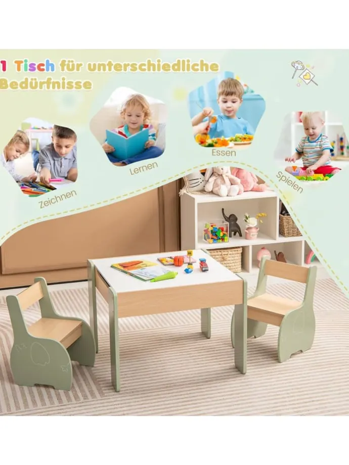 Mit 2 wendbaren und abnehmbaren Platten kann dieser Aktivitätstisch in einen Spielzeugtisch, Schreibtisch, eine Malstation und sogar einen Esstisch verwandelt werden. Der große versteckte Stauraum mit Fallschutz ermöglicht es Kindern, Spielzeug aufzubewahren und zu sortieren und so eine gute Aufräumgewohnheit zu entwickeln. Dieses Tischset für Kinder besteht aus einer stabilen Holzstruktur und ist langlebig, kinderfreundlich und stabil. Zwei Stühle helfen Ihrem Kind, Spaß zu haben, zu lernen und mit Freunden zu spielen. Nach dem Spielen können Kinder die Stühle platzsparend unter den Tisch stellen. Ob Geburtstag oder Weihnachten, dieses Möbelset in Kindergröße mit hübscher Elefantenform ist immer die beste Wahl für ein Geschenk.