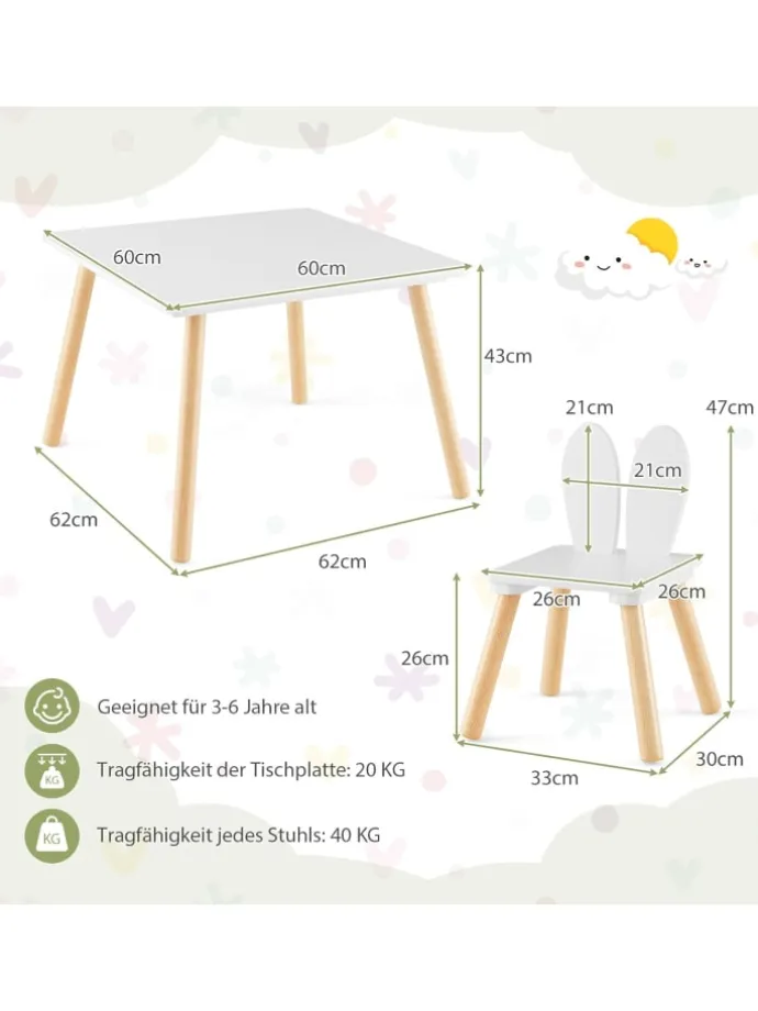 Die niedliche Rückenlehne mit Hasenohren macht das Set attraktiver