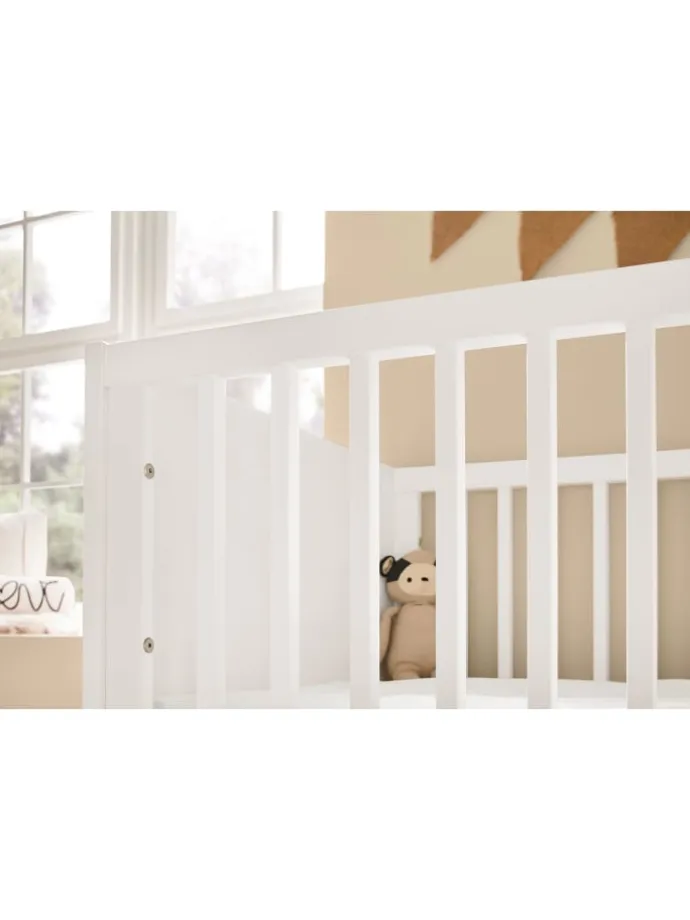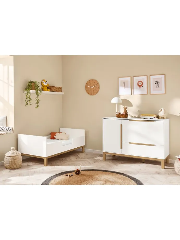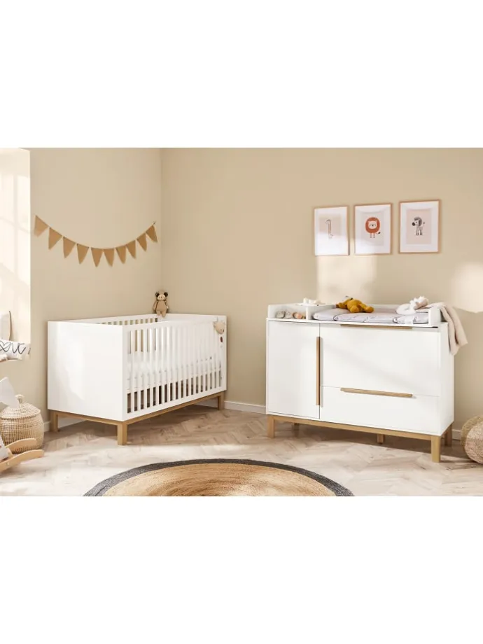 Kinderzimmer-Set Juna breit mit Windeleimerauszug, 3-tlg.: 3-teiliges Kinderzimmer-Set ‚Juna‘ breit mit Kinderbett und breiter Wickelkommode inkl. Windeleimerauszug. Edelmatt: MDF Uni, weiß lackiert und massiv, Eiche klar lackiert. Kinderbett L 144 x B 77 x H 87 cm, Matratzenmaß 140 x 70 cm, Wickelkommode B 129 x T 78 bzw. 67 x H 102 cm. Das Gitterbett ist mit 3 praktischen Schlupfsprossen ausgestattet. Für ein leichtes aus dem Bett heraus- und wieder hereinkrabbeln. Der Lattenrost von ‚Juna‘ ist 3-fach höhenverstellbar (von 24 auf 40 und 53 cm). Umbaubar zu Kindersofa und Juniorbett. ‚Juna‘ bietet viel Platz: In den 2 Schubkästen befinden sich 2 innenliegende Schubladen, eine davon mit 4-facher Wäscheeinteilung. Der Wickelaufsatz kann abgenommen werden und die 3-fache Einteilung wahlweise links oder rechts montiert werden, Wickelhöhe 92 cm. Die elegante Lösung den Windeleimer im Kinderzimmer zu platzieren: In der Wickelkommode. Der Auszug ist passend für gängige Windeleimer mit einem Ø 24 cm und einer max. Höhe von 50 cm (z.B. der Chicco Windeleimer Odour Off). Ausgestattet mit Self-Soft-Close. Pinolino erfüllt seit 1997 Kinderträume und vertreibt Kindermöbel, Accessoires und Spielwaren. Das deutsche, FSC®-zertifizierte Unternehmen verwendet ausschließlich für Kinder geeignete Lacke, Lasuren und Öle.