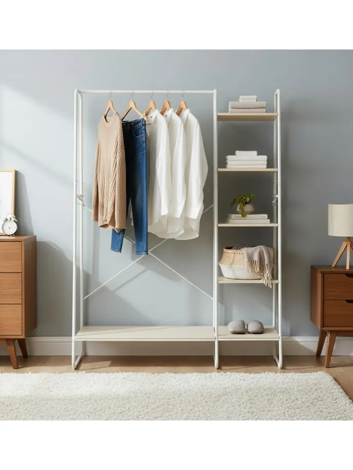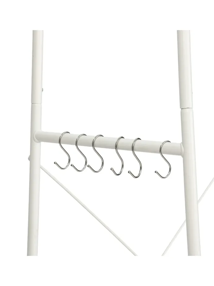 Diese offene Flurgarderobe mit 6 beweglichen Haken schafft ordentlich Stauraum in Flur, Schlaf- oder Gästezimmer. Hänge Deine Jacken, Mäntel, Blusen und andere Kleidungsstücke übersichtlich an der Garderobe auf. Auf den Regalebenen des freistehenden Kleiderständers lassen sich Aufbewahrungsboxen, Taschen oder Accessoires verstauen. Auch Deine Schuhe hast Du auf der breiten Ablagefläche immer griffbereit. Das Design aus Metall und Holzoptik fügt sich gut in verschiedene Einrichtungen.