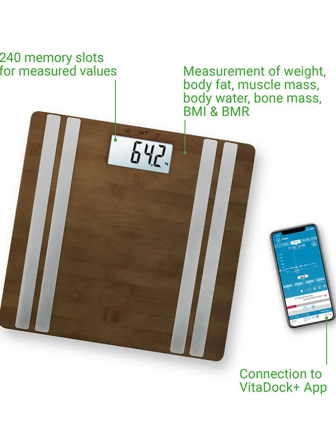 – Messung von Gewicht, Körperfett, Körperwasser, Muskelmasse und Knochengewicht