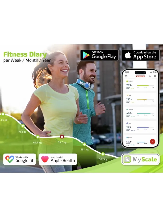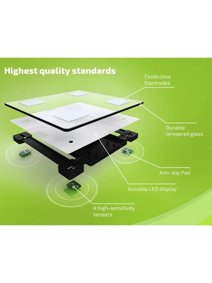 – Bereitstellung genauer Werte für Körperparameter in der App, wie z. B. Gewicht, Fett-, Wasser- und Muskelanteil, sowie BMI und Kalorienbedarf