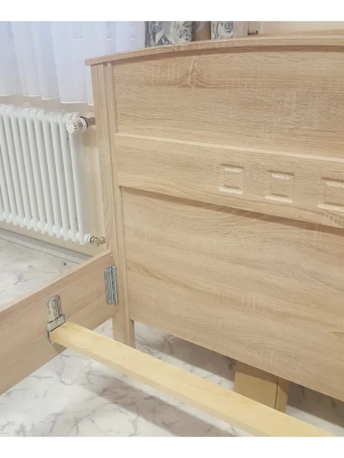 Schönes, modernes Einzelbett in Eiche Sonoma Dekor. Liegefläche ca. 100 x 200 cm. Das Bett ist 3-fach höhenverstellbar. Außenmaße BxHxT ca. 110x95x207 cm. Die Applikationen am Bett sind MDF profiliert mit PVC-Tiefziehfolie.