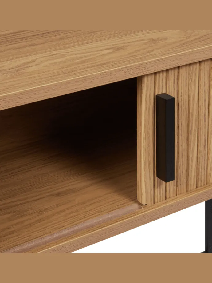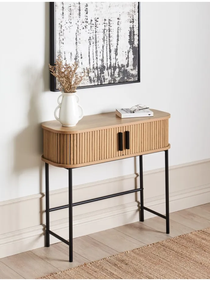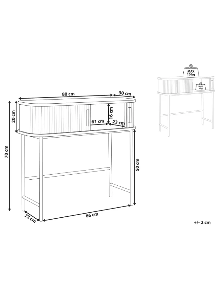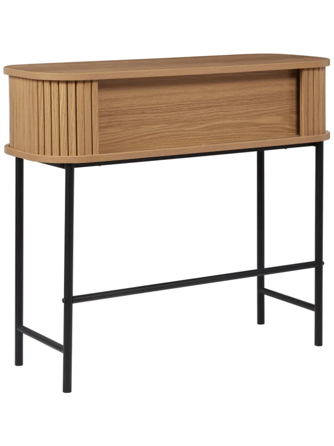 Konsolentisch im Retro-Look. Dekorieren Sie Ihr Wohnbereich mit diesem Konsolentisch und organisieren Sie den Raum mit seinem Design. Dieses schicke Möbelstück verfügt über zwei elegante Schiebetüren, hinter denen sich geräumige Stauräume für Accessoires und andere wichtige Dinge verbergen, die für eine aufgeräumte Umgebung sorgen. Das Retro-Design in Kombination mit dem hellen Farbton und den schwarzen Beinen setzt Akzente und passt zu vielen Einrichtungsstilen. Die hochwertigen Materialien – MDF für den Korpus und Kiefernholz für die Griffe – garantieren nicht nur eine einfache Pflege, sondern auch eine lange Lebensdauer und machen das Möbelstück zu einer praktischen und stilvollen Ergänzung für Ihr Zuhause.
