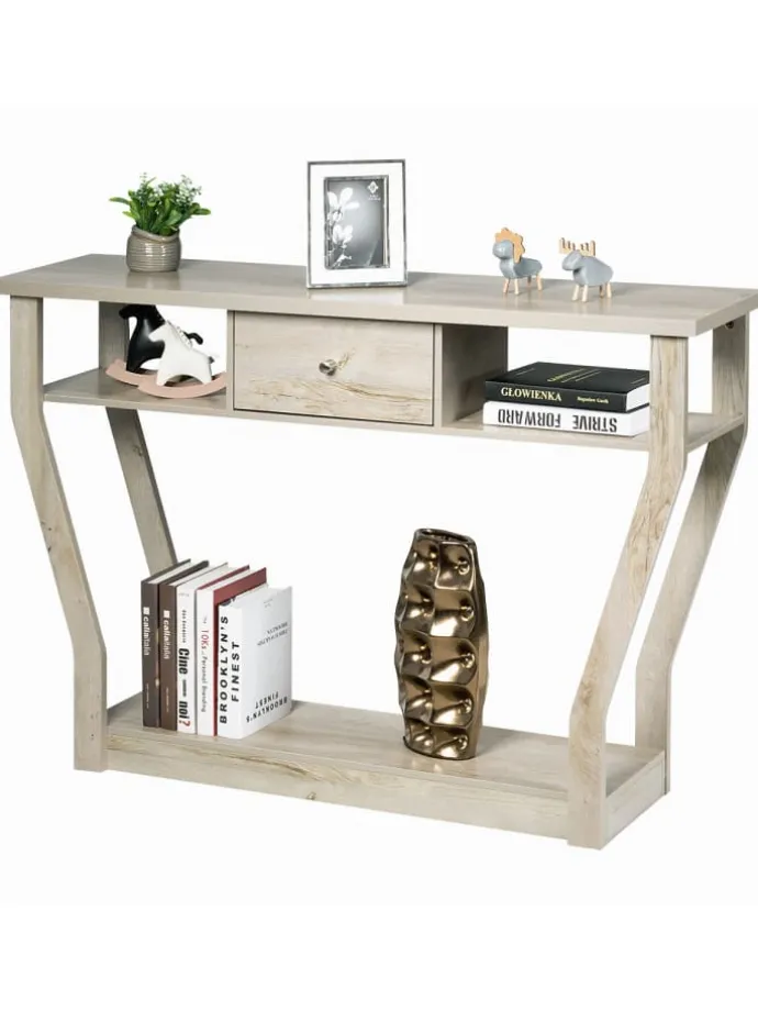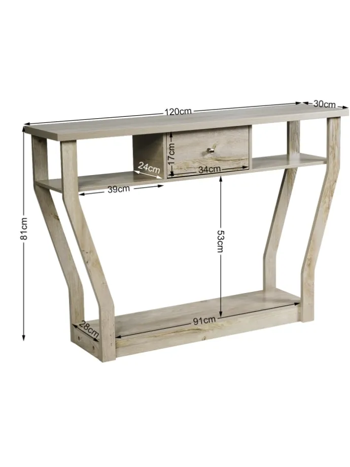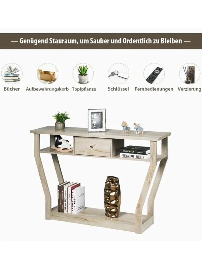 Unser eleganter und modischer Konsolentisch kann Ihnen ein schönes und ordentliches Wohnumfeld bieten. Der robuste und langlebige Tisch ist aus hochwertigem MDF hergestellt, besitzt harte Oberflächen, die verschleißfest und wasserfest sind, sodass diese nicht leicht zerkratzen. Das Untergestell und der Anti-Kippbeschlag sorgen für eine stabile und sichere Nutzung des Konsolentisches. Drei offene Regale und eine zusätzliche Schublade bieten genügend Stau- und Ausstellungsfläche, damit Sie Ihre Gegenstände nach Ihren Bedürfnissen sortieren können. Die einzigartig geschwungenen Beine sind stilvoll designt und sorgen für eine optimale Verwendung im Wohn- und Schlafzimmer, Flur und den Eingangsbereich.