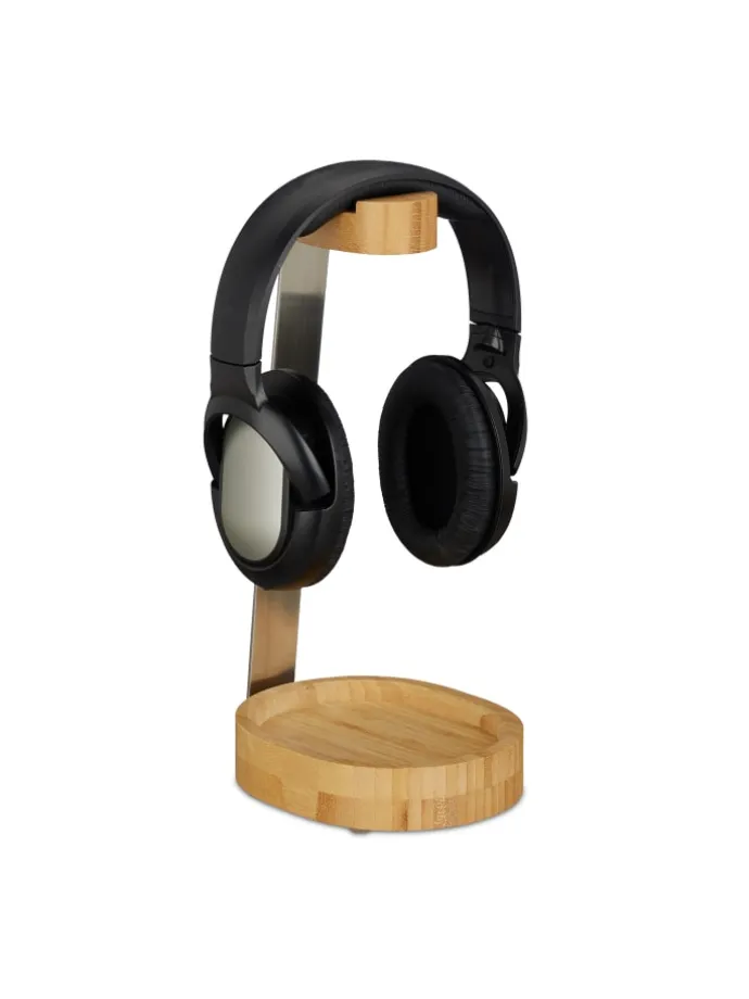 Der trendige Kopfhörer Ständer besticht durch seine natürliche Holzoptik und sein schlichtes Design. Je nach Bügelbreite bietet der Headset Halter Platz für bis zu zwei Kopfhörer gleichzeitig. Die gummierten Standfüße schützen dabei die Oberflächen Ihres Tisches.