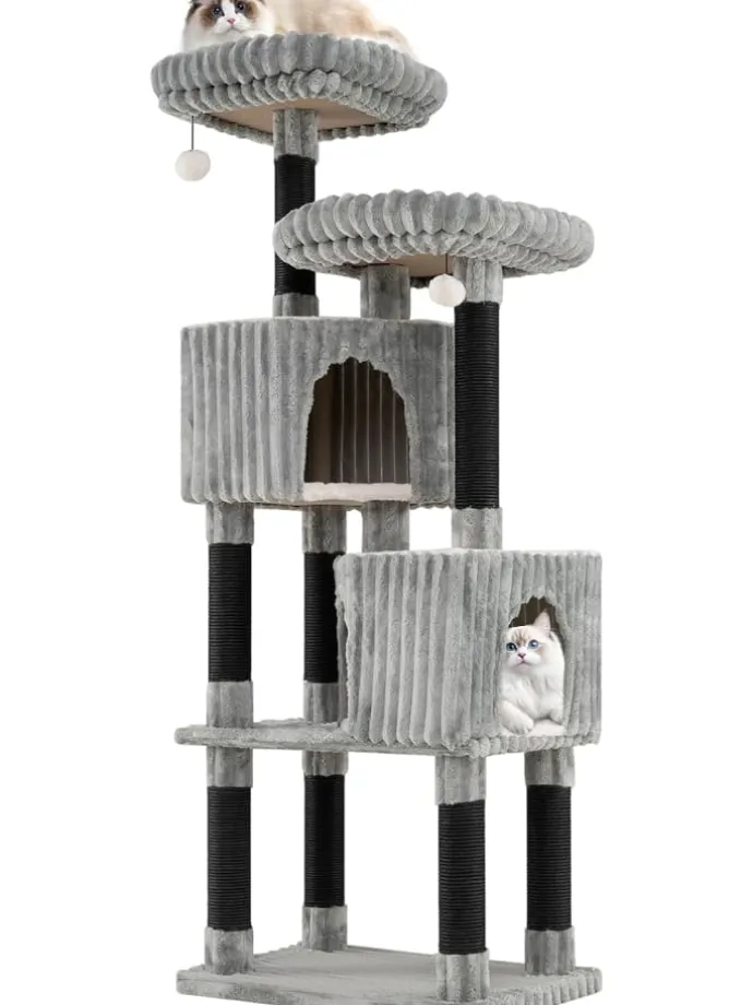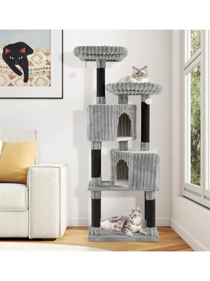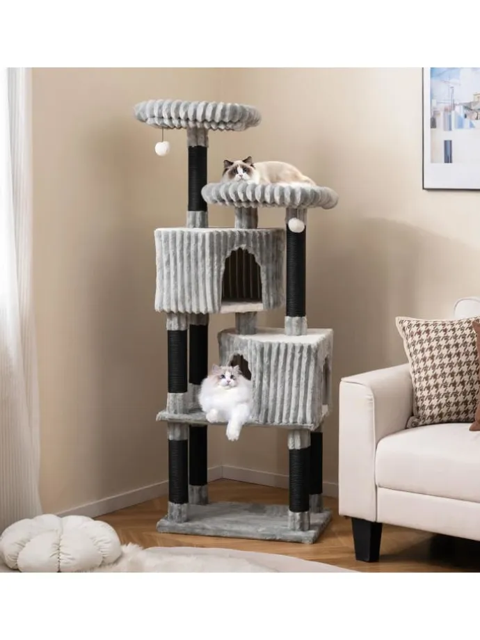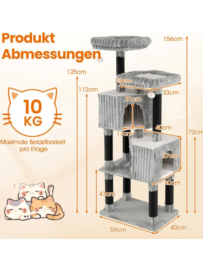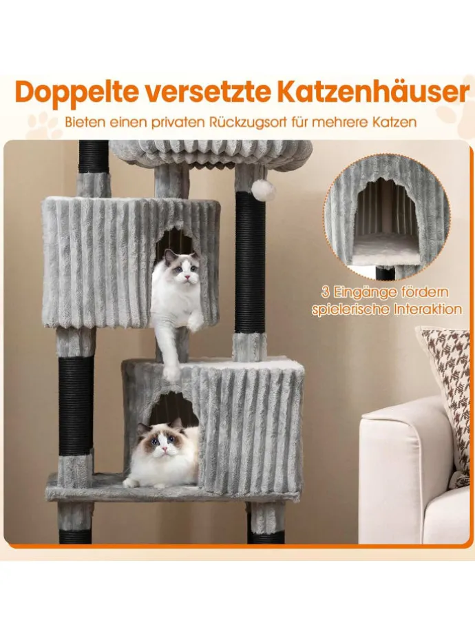 Verwöhnen Sie Ihre Samtpfoten mit einem gemütlichen Zufluchtsort, dank des Flanell-Katzenbaums. 2 erhöhte, weich gepolsterte Liegeflächen bieten ideale Aussichtspunkte, an denen Katzen entspannen und ihre Umgebung beobachten können. Jedes Liegebett ist abnehmbar und waschbar für einfache Reinigung. In Mehrkatzenhaushalten fördern zwei versetzte Kuschelhöhlen mit drei Eingängen spielerische Interaktion. Die Liegebetten und Kuschelhöhlen sind mit warmem Fake-Kaninchenfell ausgekleidet und bieten extra Komfort. Zudem laden zwei weiche Pompons mit Glocken zum Jagen und Spielen ein, was Stress abbaut. Mehrere Kratzstangen unterstützen das natürliche Kratzverhalten und schützen Ihre Möbel.