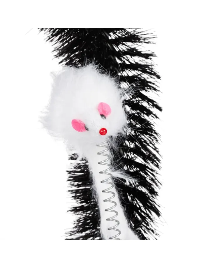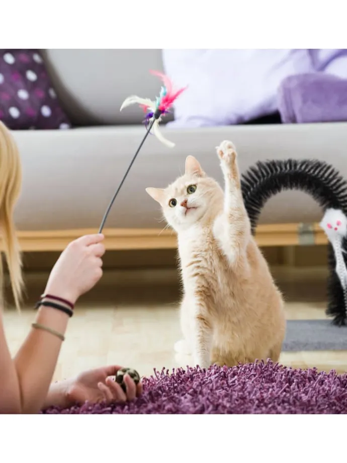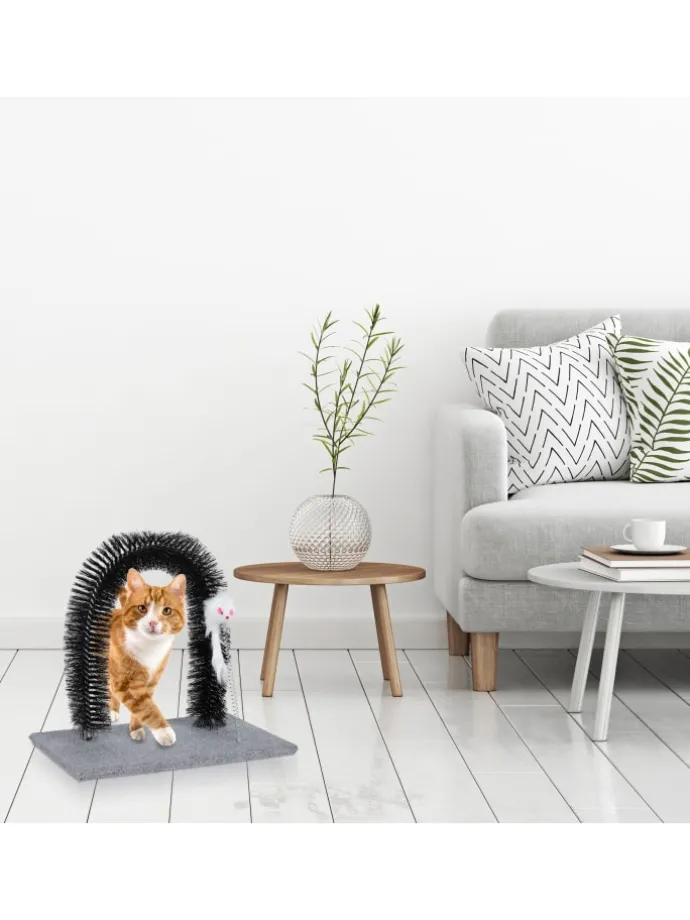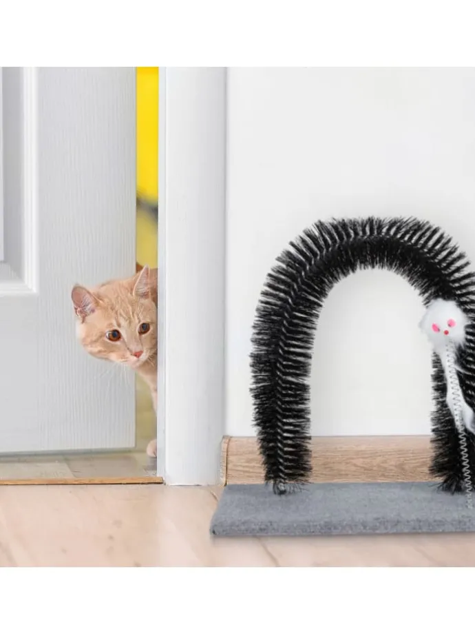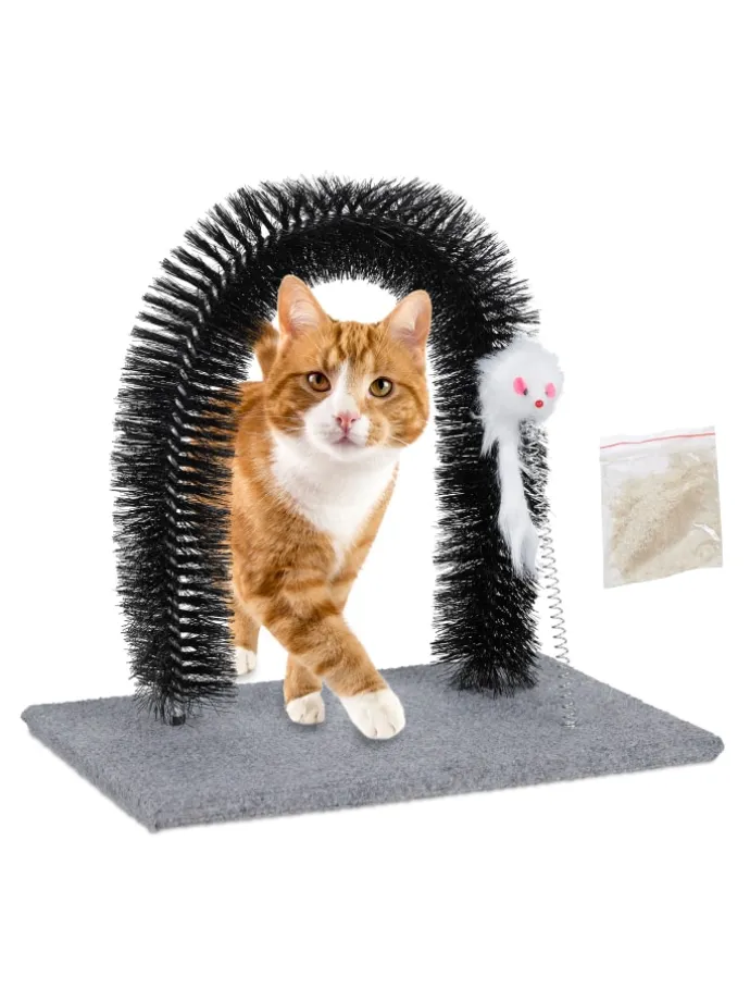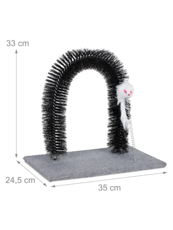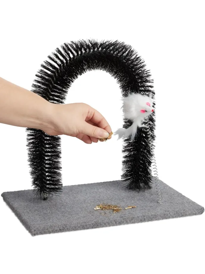 Mit diesem Enthaarungsbogen machen Sie Schluss mit Katzenhaaren in der gesamten Wohnung und tun Ihrer Samtpfote zusätzlich etwas Gutes. Während sich Ihr Stubentiger durch den Kratzbogen windet, werden verknotete und abgestorbene Haare entfernt und sein Rücken sanft massiert. Das Fell bleibt in den Borsten hängen, wo es anschließend einfach wieder entfernt werden kann. Dank der flauschigen Maus an der flexiblen Feder wird Ihre Katze immer wieder spielerisch zum Fellpflegebogen gelockt.