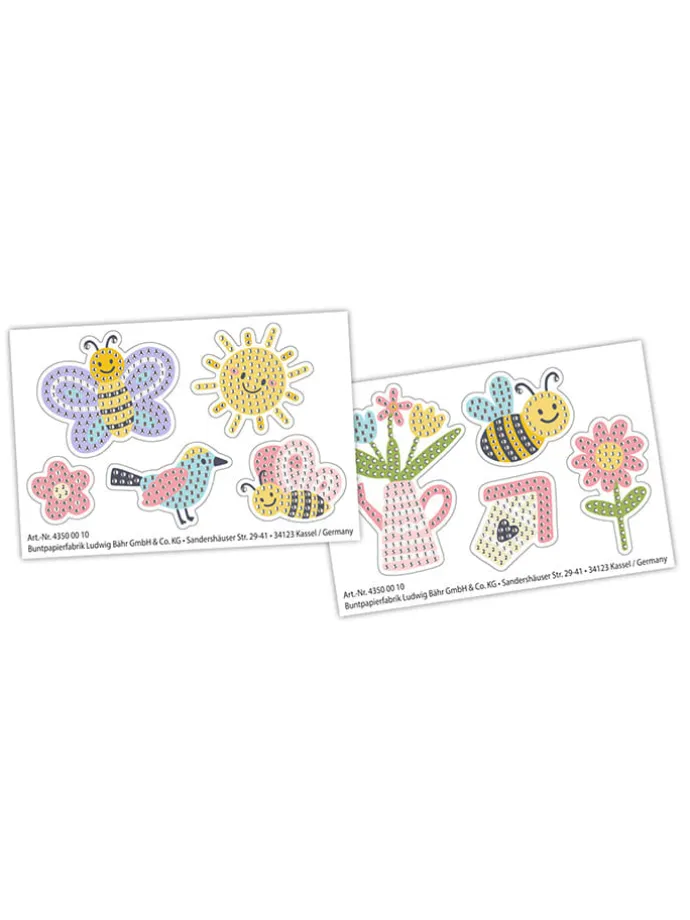 – Inhalt: 2 Stickerbögen (15 x 10 cm) mit verschiedenen Designs, Diamantsteine (sortiert in verschiedenen Farben), 2 Picker, Tablett, Wachskleber, Bastelanleitung