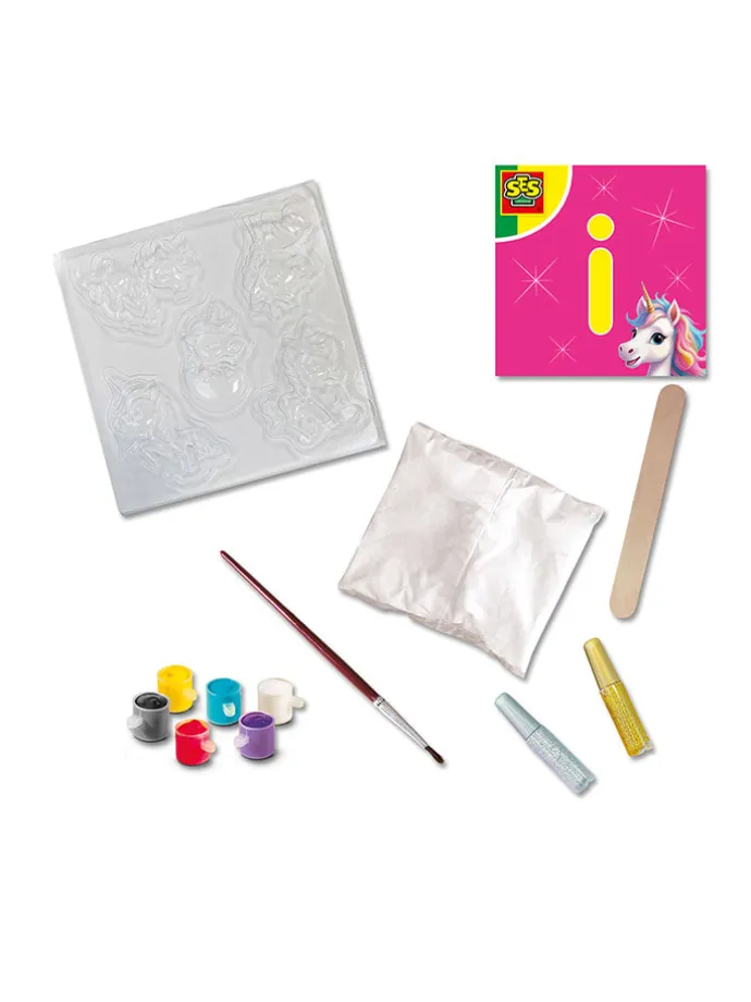 – Inhalt: Gießform Einhörner, Gips (300 g), Holzspachtel, 6 Farben Plakatfarbe, Glitzerkleber Gold, Glitzerkleber Silber, Pinsel, Anleitung