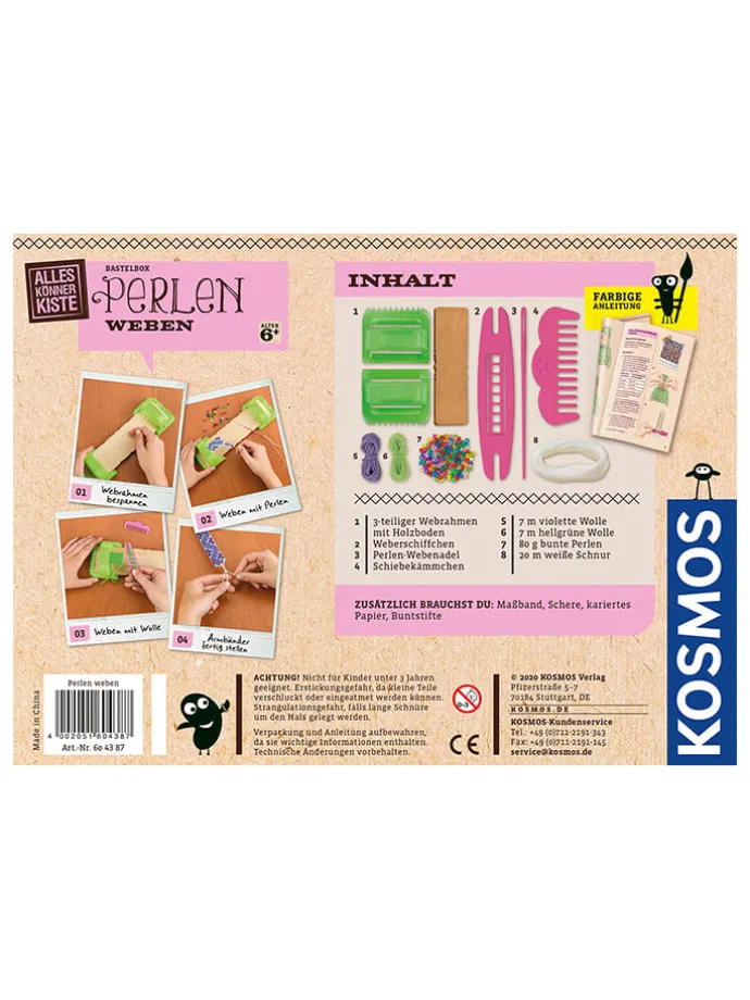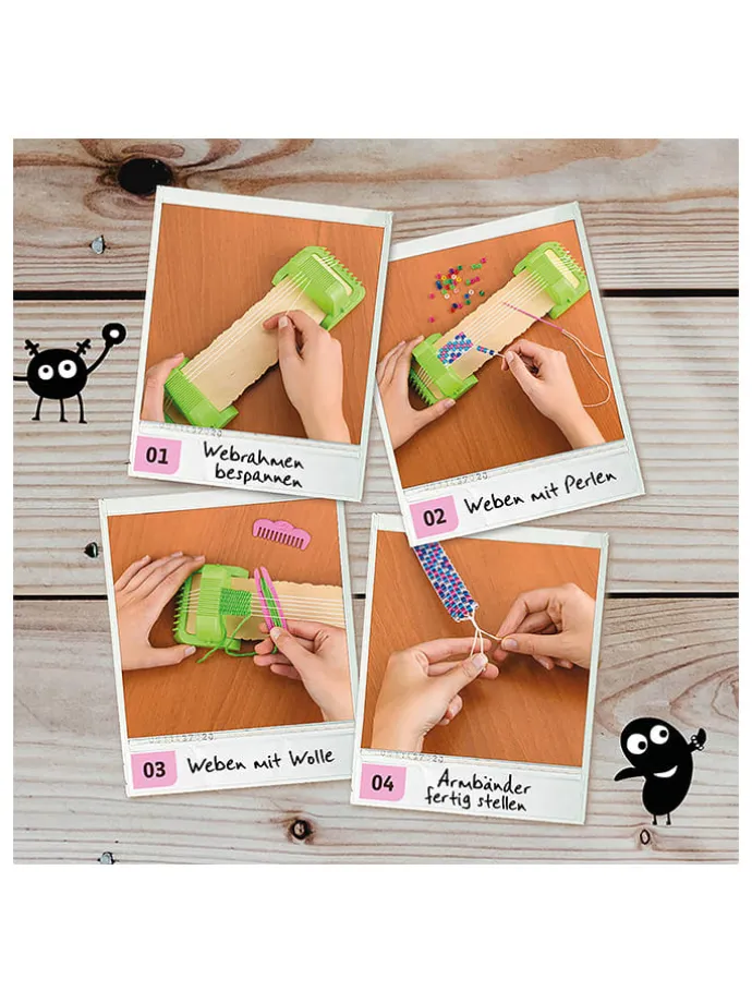 Coole Armbänder, gewebt mit Perlen oder Wolle: mit dem „2-in-1-Perlenwebrahmen“ Kinder ab 6 Jahren zu Designern. Einfach der anschaulichen Anleitung folgen und den stabilen Webrahmen aus Holz und Kunststoff fix aufbauen. Der Webrahmen lässt sich schnell und einfach bespannen – so kann es sofort losgehen! Das süße Webschiffchen dient gleichzeitig als Halterung für die Musterkärtchen. Die extra-handlichen Perlen lassen sich super easy aufziehen – schneller Erfolg garantiert. Dabei können sich die kleinen Künstler überlegen, ob sie nur mit Wolle, mit Perlen oder mit beidem gleichzeitig weben möchten. Während sie ihrer kreativen Fantasie freien Lauf lassen, schulen sie nebenbei ihre feinmotorischen Fähigkeiten und ihre Geduld. Weben und staunen