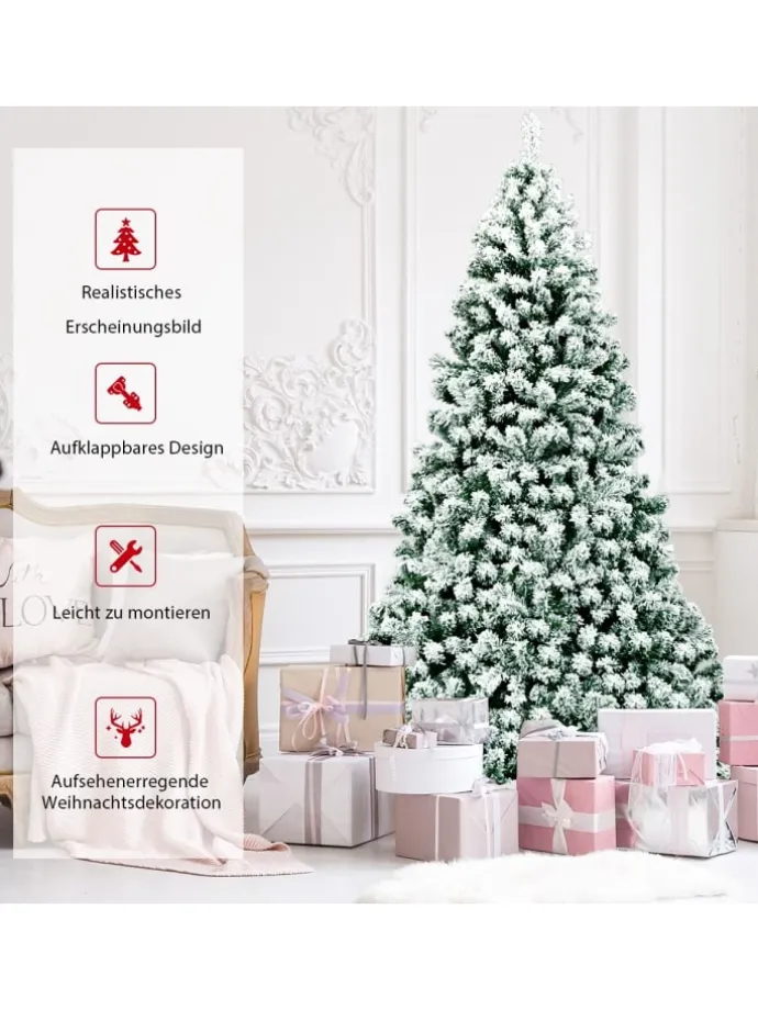 Verwandeln Sie Ihr Wohnzimmer in ein einzigartiges Winterwunderland mit unserem beleuchteten und schneebedeckten Weihnachtsbaum. Der Baum, der aus 1364 Zweigen und schneebedeckten Nadeln gefertigt ist, ist dicht und elegant. Er sieht fast wie ein echter Baum aus. Aus hochwertigem PVC hergestellt fallen die sorgfältig verarbeiteten Nadeln nicht leicht ab und verblassen nicht, was eine langfristige Nutzung gewährleistet. 550 warme LED-Leuchten, die an den Zweigenangebracht sind, bringen einen festlichen Glanz in Ihr Zuhause. Gestützt von einem stabilen Metallständer wird dieser künstliche Weihnachtsbaum auch in den kommenden Jahren aufrecht stehen. Gleichzeitig ist der Metallständer klappbar, um die Lagerung zu erleichtern. Dank der klappbaren Konstruktion lässt sich der künstliche Baum leicht aufstellen und aufschütteln. Darüber hinaus kann er in 4 Abschnitte unterteilt und in einer Aufbewahrungstasche untergebracht werden, sodass er später leicht wiederverwendet werden kann. Mit seinem hübschen Aussehen wird dieser schneebedeckte Weihnachtsbaum mit Sicherheit überall eine tolle Dekoration sein.