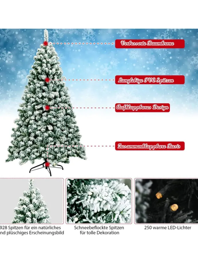 Verwandeln Sie Ihr Wohnzimmer in ein einzigartiges Winterwunderland mit unserem beleuchteten und schneebedeckten Weihnachtsbaum. Der Baum, der aus 928 Zweigen und schneebedeckten Nadeln gefertigt ist, ist dicht und elegant. Er sieht fast wie ein echter Baum aus. Aus hochwertigem PVC hergestellt fallen die sorgfältig verarbeiteten Nadeln nicht leicht ab und verblassen nicht, was eine langfristige Nutzung gewährleistet. 250 warme LED-Leuchten, die an den Zweigenangebracht sind, bringen einen festlichen Glanz in Ihr Zuhause. Gestützt von einem stabilen Metallständer wird dieser künstliche Weihnachtsbaum auch in den kommenden Jahren aufrecht stehen. Gleichzeitig ist der Metallständer klappbar, um die Lagerung zu erleichtern. Dank der klappbaren Konstruktion lässt sich der künstliche Baum leicht aufstellen und aufschütteln. Darüber hinaus kann er in 3 Abschnitte unterteilt und in einer Aufbewahrungstasche untergebracht werden, sodass er später leicht wiederverwendet werden kann. Mit seinem hübschen Aussehen wird dieser schneebedeckte Weihnachtsbaum mit Sicherheit überall eine tolle Dekoration sein.