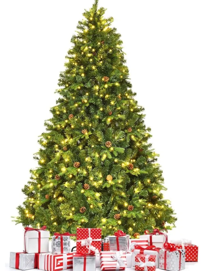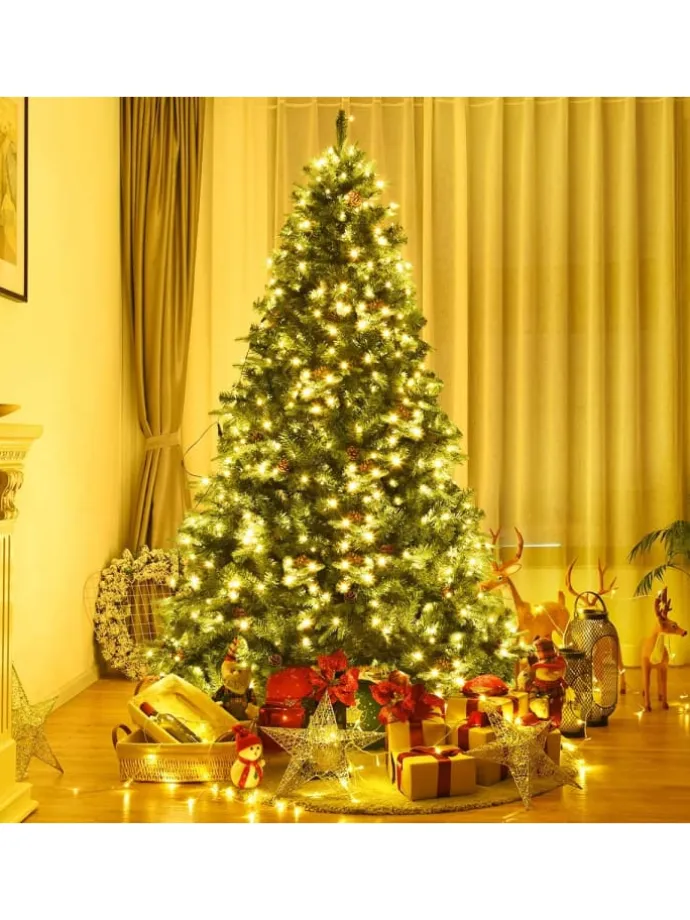 Maße: 225cm mit 1125 Spitzen, 540 Stück LED, 71 Kiefernzapfen, Durchmesser des Fußes 55cm