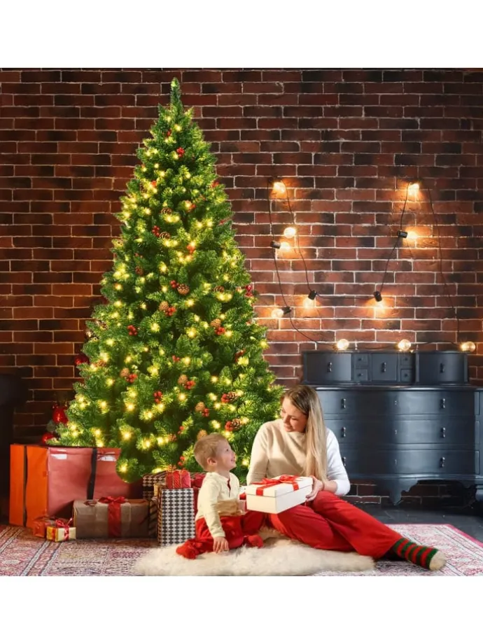 Er ist hoch, dicht und flauschig mit 516 Zweigen, die eine tolle Dekoration zu Weihnachten sind. 450 LED-Leuchten sowie 56 Bündel von Tannenzapfen und roten Beeren sorgen für eine wohlige Festtagsstimmung und machen den Baum noch prächtiger und schöner. Die PVC-Zweige sind umweltfreundlich und feuerbeständig für den Langzeitgebrauch. Der eiserne Ständer stützt den Baum stabil, sodass er nicht umkippt. Außerdem sind die Zweige durch Scharniere mit dem Stamm verbunden, so dass sie in kurzer Zeit mühelos zurechtgebogen werden können. Der Baum eignet sich für den privaten und geschäftlichen Gebrauch.