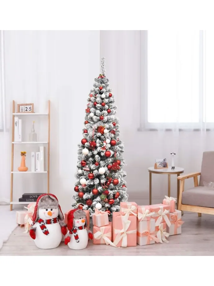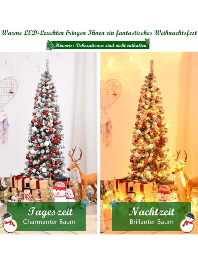 Verwandeln Sie Ihr Wohnzimmer in ein tolles Winterwunderland mit unserem beleuchteten, schneebedeckten Bleistift-Weihnachtsbaum. Der Baum, der mit 500 Zweigen und schneebedeckten Nadelnausgestattet ist, ist dicht und elegant. Er sieht fast wie ein echter Baum aus. 250 warme LED-Lichter sorgen für eine festliche Beleuchtung in Ihrem Zimmer. Die hochwertigen PVC-Zweige mit sorgfältiger Verarbeitung fallen nicht ab oder verblassen, was eine langfristige Nutzung gewährleistet. Gestützt von einem stabilen Metallständer wird dieser künstliche Weihnachtsbaum auch in den kommenden Jahren aufrecht stehen. Gleichzeitig ist der Ständer faltbar, um die Lagerung zu erleichtern. Dank der klappbaren Konstruktion lässt sich der künstliche Baum leicht aufstellen und aufschütteln. Mit seinem schlanken Bleistiftdesign und seinem realistischen Aussehen ist dieser künstliche Weihnachtsbaum perfekt für das Aufstellen in Ecken oder kleinen Räumen. Feiern Sie Weihnachten stilvoll mit unserem schneebedeckten Bleistift-Weihnachtsbaum!
