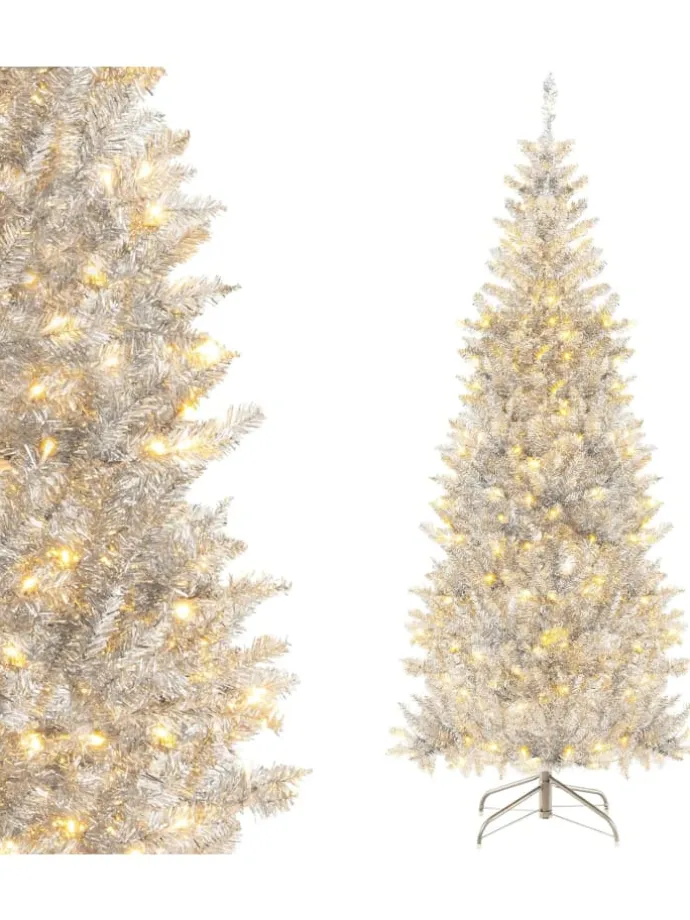 Verleihen Sie Ihrer Weihnachtsfeier einen Hauch von Eleganz und Romantik! Unser 180 cm vorbeleuchteter künstlicher Weihnachtsbaum verfügt über 790 üppige Zweigspitzen mit glänzender Silberfolie, die einen bezaubernden und realistischen Winterlook ausstrahlen. Darüber hinaus kann der Baum nicht nur tagsüber eine attraktive Dekoration sein, sondern auch nachts mit seinen 300 hellen LED-Lichtern Ihr Zuhause erhellen und so eine gemütliche und bezaubernde Atmosphäre schaffen. Unser Baum aus ist feuerbeständigem PVC gefertigt und wird von einem stabilen, gekreuzten Metallsockel getragen.