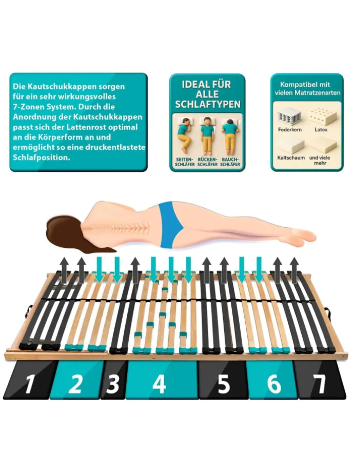 Der Drömson Lattenrost wurde mit Blick auf ergonomische Prinzipien entwickelt, um Ihnen einen erholsamen Schlaf zu ermöglichen. Ein wichtiges Element sind die belastbaren Duo-Kappen, die die Federholzleisten aufnehmen und für eine optimale Federung sorgen. Die sieben verschiedenen Liegezonen des Lattenrosts passen sich perfekt an die Anatomie Ihres Körpers an und unterstützen Wirbelsäule sowie Gelenke in jeder Schlafposition. Insbesondere im Schulter-, Becken- und Wadenbereich sorgen weichere Kappen für eine gezielte Entlastung. Die Möglichkeit, die Härtegradeinstellung in der Mittelzone individuell anzupassen, ermöglicht es Ihnen, Ihren persönlichen Schlafkomfort fein abzustimmen und für eine optimale Schlafposition zu sorgen.