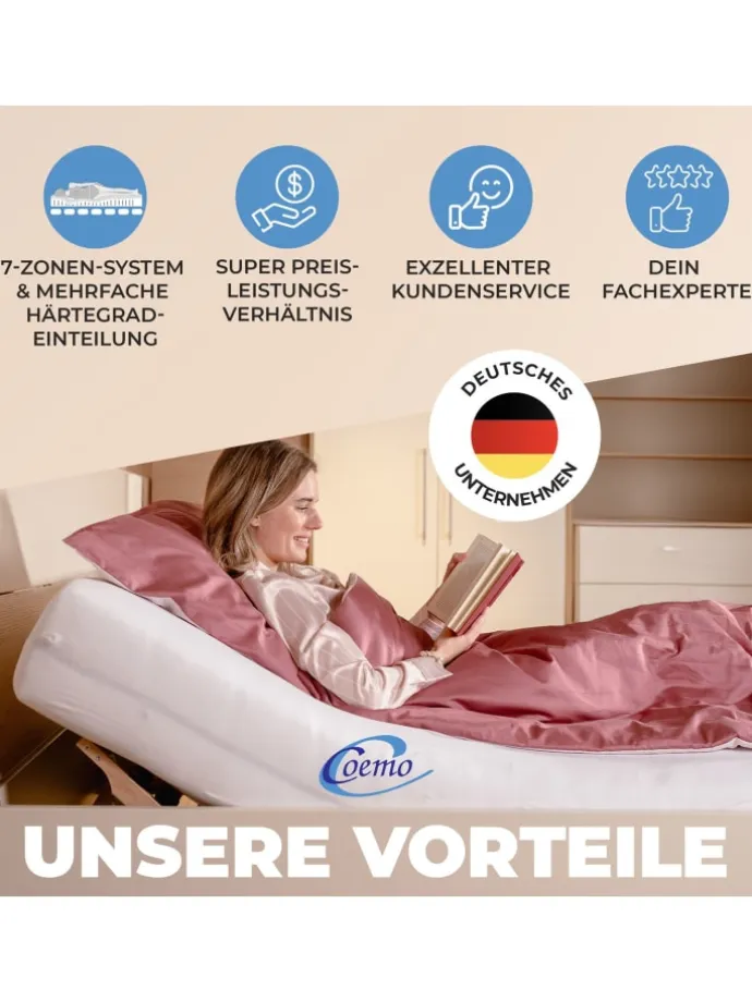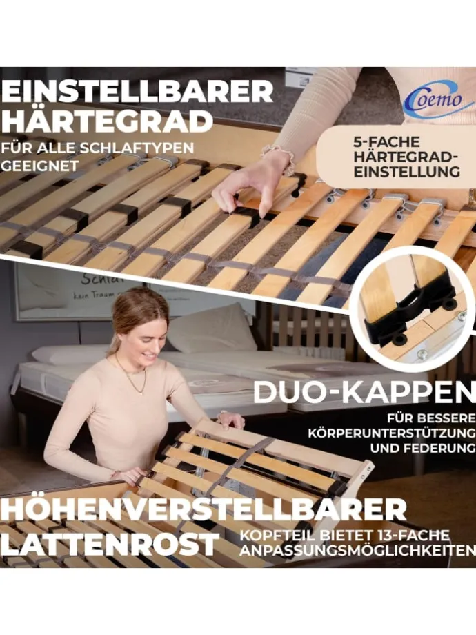 Der ERGO K Lattenrost mit 7-Zonen und Kopfteilverstellung bietet mit seinen 28 flexiblen Federholzleisten genau das. Selbst wenn Sie bereits denken, dass Sie in Ihrem Bett bequem schlafen, kann der ergonomische Lattenrost mit 7-Zonen-Unterstützung Ihren Komfort noch weiter steigern. Sieben verschiedene Liegezonen und eine verstellbare Kopfstütze ermöglichen es Ihnen, Ihren Schlaf- und Liegekomfort individuell zu verbessern. Das Lesen und Frühstücken im Bett wird zu einem wahren Genuss und auch Ihr Schlaf wird durch den Lattenrost entspannter und erholsamer.