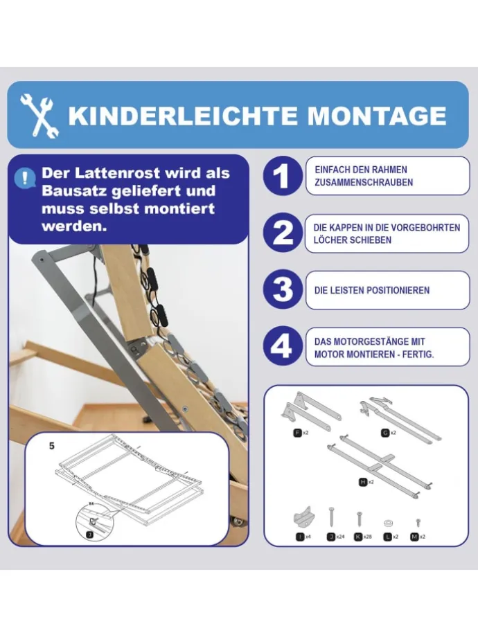 Achtung! Motorrahmen benötigen Baufreiheit über die gesamte Liegefläche. Für den Motor werden mindestens 12,5 cm benötigt. Bitte überprüfen Sie vor Kauf, ob Ihr Bettgestell für Motorrahmen geeignet ist.