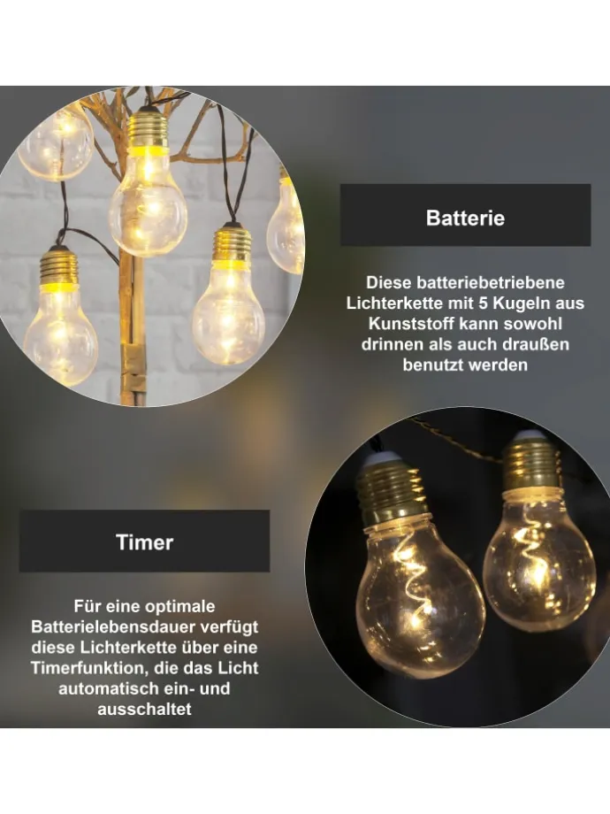 LED Deko-Lichterkette ,Glow‘, 5 Glühbirnen, Batterie & Timer, klar, warmweiß, 100cm