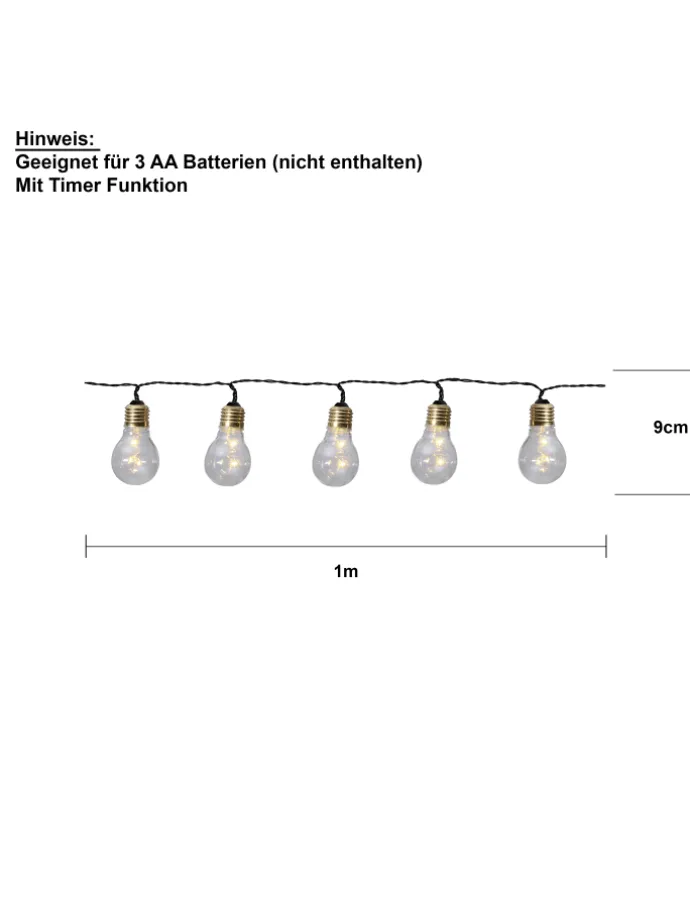 Unsere LED Lichterkette ,Glow‘ mit fünf klaren Glühbirnen, Batterien und Timer ist die ideale Wahl, um deine Wohnräume dekorativ zu beleuchten. Die Glühbirnen mit ihrer klassischen Form bringen Retro-Charme in deine vier Wände und schaffen durch ihr warmweißes Licht eine gemütliche Atmosphäre, die zum Verweilen einlädt.