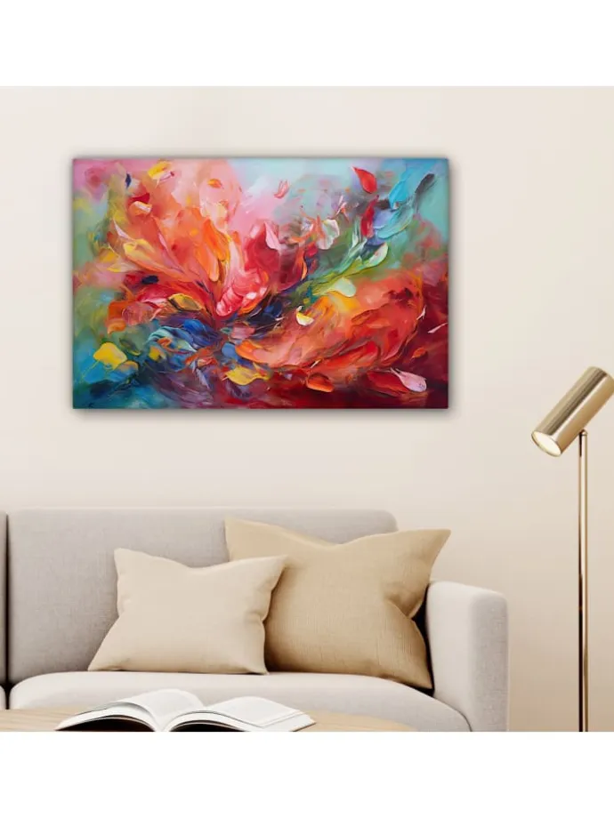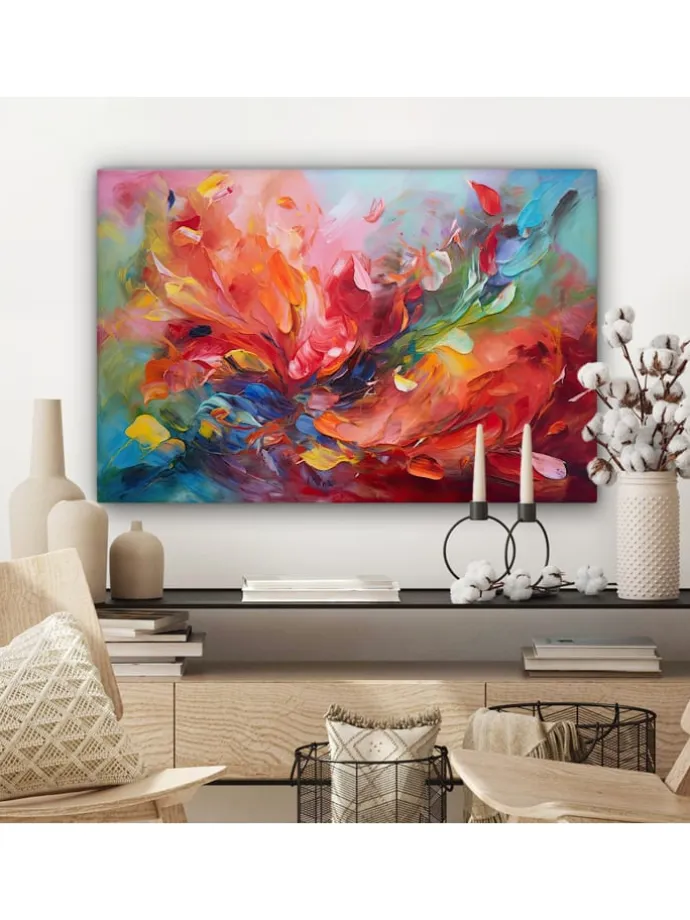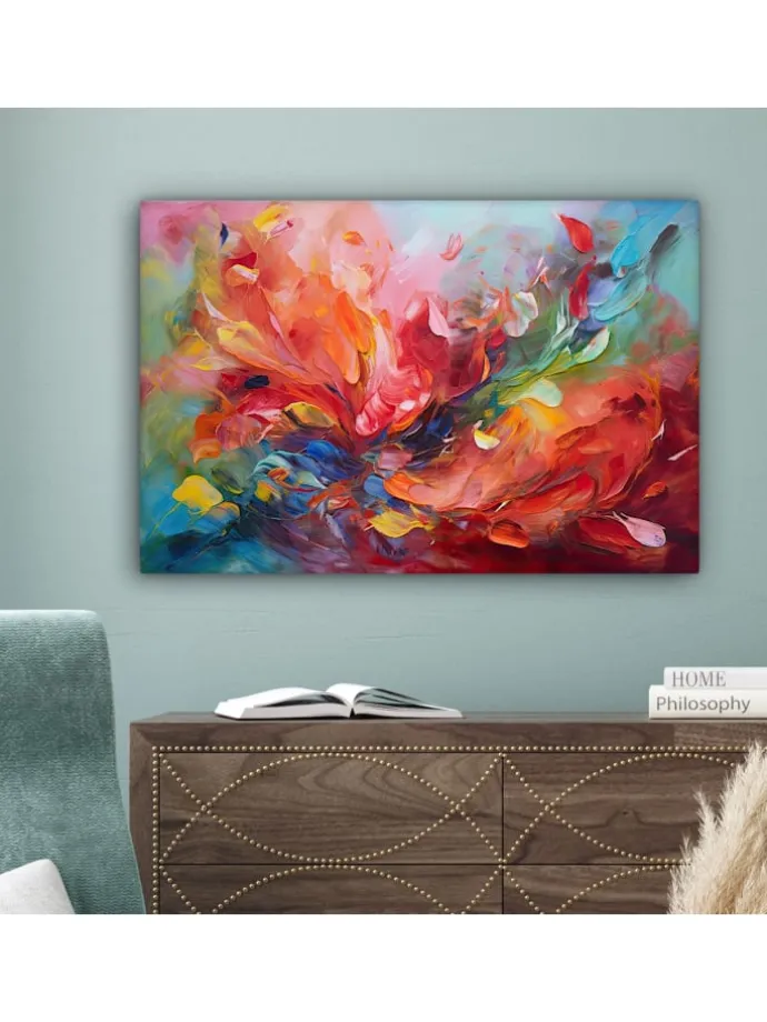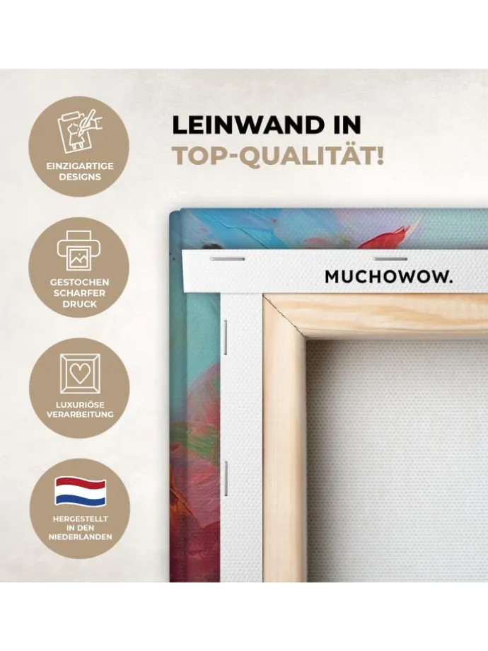 Dieses wunderschöne Gemälde wird in höchster Auflösung auf Leinwand gedruckt. Dies garantiert einen gestochen scharfen, farbechten Druck mit leuchtenden Farben. Die Seiten der Leinwand sind mit einem Beschnitt des Fotos bedruckt. Dadurch passen auch diese Seiten der Leinwand gut zum Foto. Das Foto wird auf robustes, 260 Gramm schweres, 0,41 mm dickes Leinwandgewebe gedruckt. Das Leinengewebe ist straff auf einen zwei Zentimeter dicken Holzkeilrahmen gespannt. Dieser Holzrahmen besteht aus FSC-zertifiziertem Kiefernholz. Das Produkt wird mit einem Standard-Aufhängesystem geliefert, mit dem sich der Druck einfach an der Wand befestigen lässt. Produkteigenschaften In verschiedenen Größen erhältlich Inklusive praktischem Aufhängesystem Auf einen 2 cm dicken Holzrahmen gespannt Wanddekoration passend für Ihr: Schlafzimmer, Wohnzimmer, Kinderzimmer, Büro, Flur, Küche und jeden anderen Raum in Ihrem Zuhause oder Ihren Geschäftsräumen Umfangreiche SammlungMuchoWow verfügt über eine umfangreiche Sammlung wunderschöner Bilder zu verschiedenen Themen.Über das Foto: Ein abstraktes Ölgemälde mit vielen Farben.