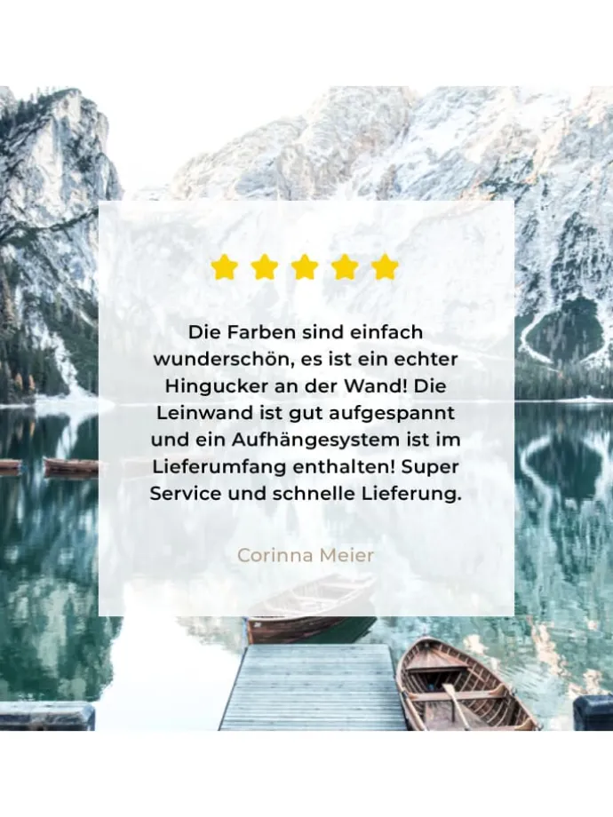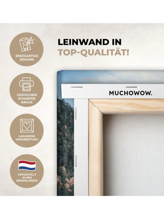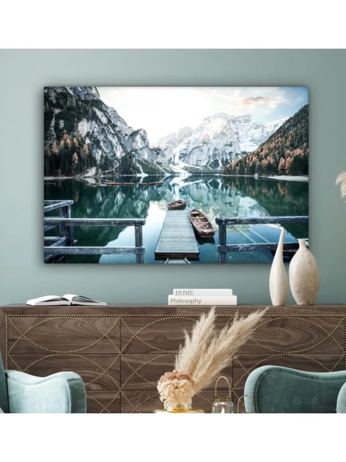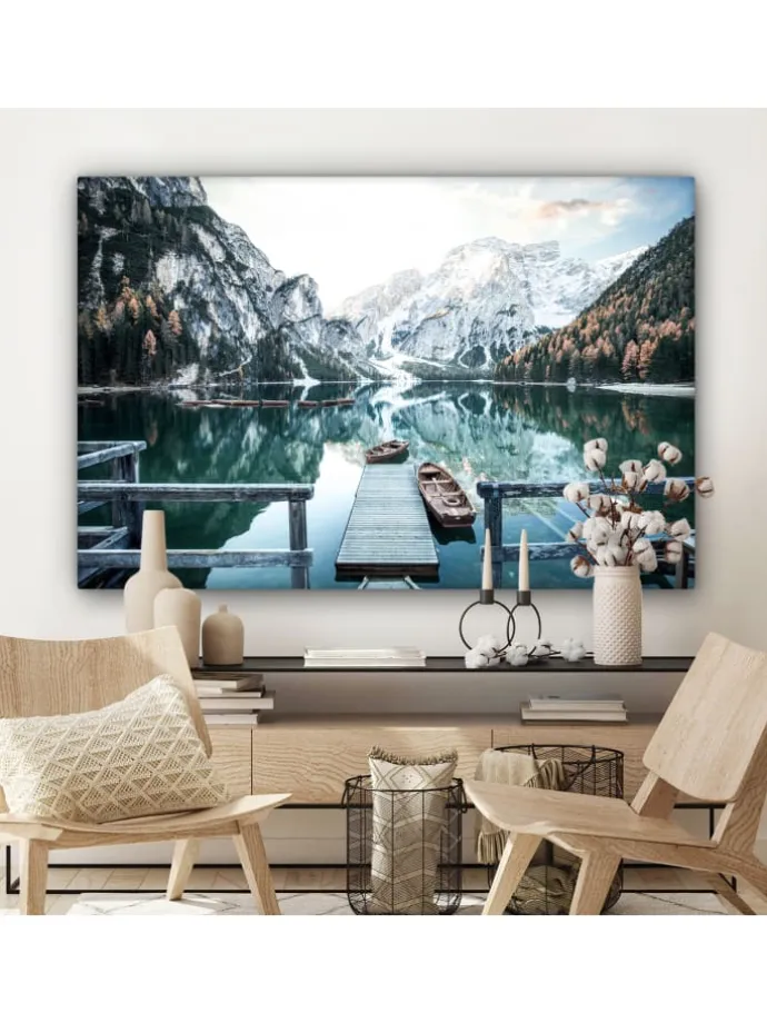 Dieses wunderschöne Gemälde wird in höchster Auflösung auf Leinwand gedruckt. Dies garantiert einen gestochen scharfen, farbechten Druck mit leuchtenden Farben. Die Seiten der Leinwand sind mit einem Beschnitt des Fotos bedruckt. Dadurch passen auch diese Seiten der Leinwand gut zum Foto. Das Foto wird auf robustes, 260 Gramm schweres, 0,41 mm dickes Leinwandgewebe gedruckt. Das Leinengewebe ist straff auf einen zwei Zentimeter dicken Holzkeilrahmen gespannt. Dieser Holzrahmen besteht aus FSC-zertifiziertem Kiefernholz. Das Produkt wird mit einem Standard-Aufhängesystem geliefert, mit dem sich der Druck einfach an der Wand befestigen lässt. Produkteigenschaften In verschiedenen Größen erhältlich Inklusive praktischem Aufhängesystem Auf einen 2 cm dicken Holzrahmen gespannt Wanddekoration passend für Ihr: Schlafzimmer, Wohnzimmer, Kinderzimmer, Büro, Flur, Küche und jeden anderen Raum in Ihrem Zuhause oder Ihren Geschäftsräumen Umfangreiche SammlungMuchoWow verfügt über eine umfangreiche Sammlung wunderschöner Bilder zu verschiedenen Themen.Über das Foto: Winterlandschaft mit schneebedeckten Berggipfeln rund um einen See.
