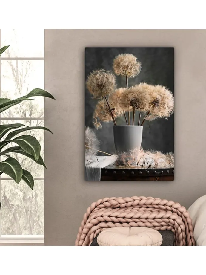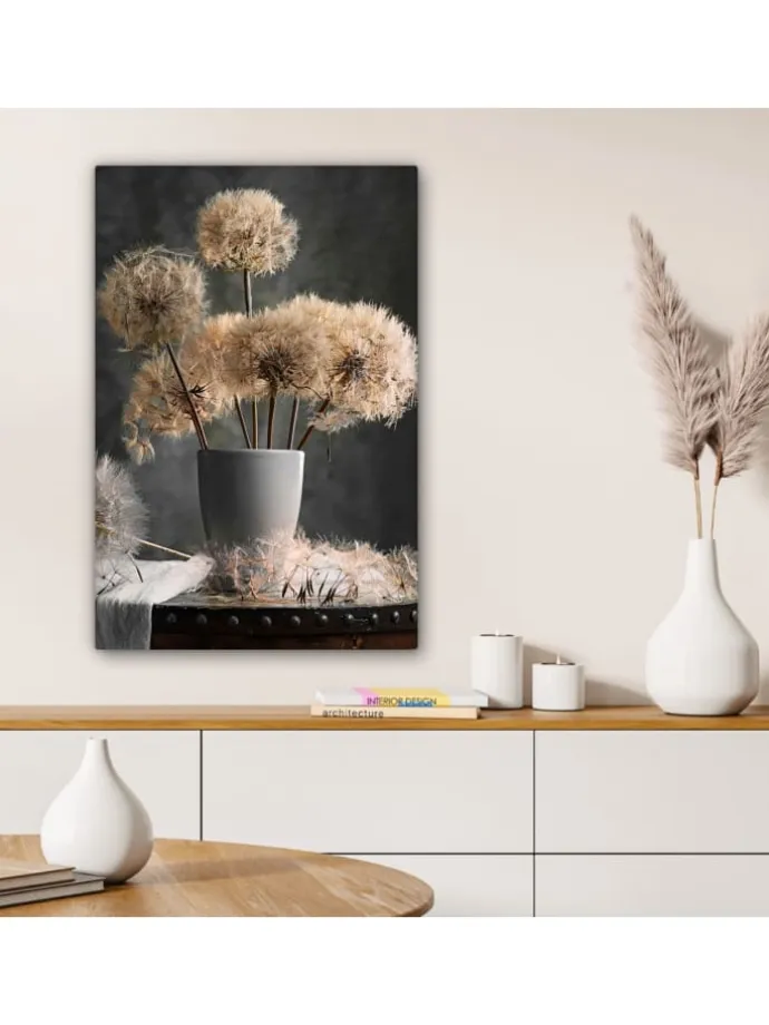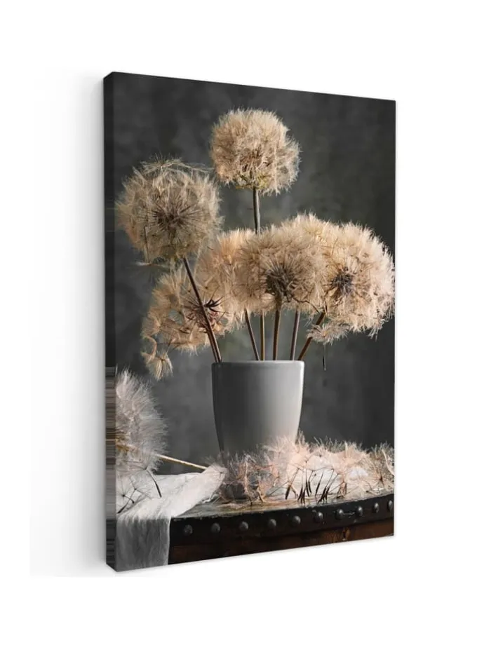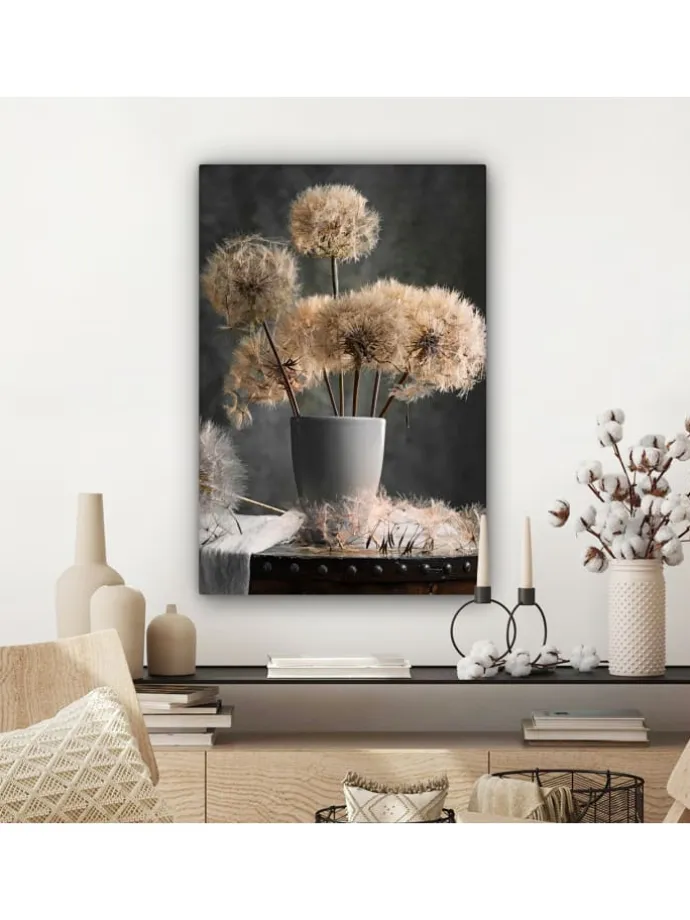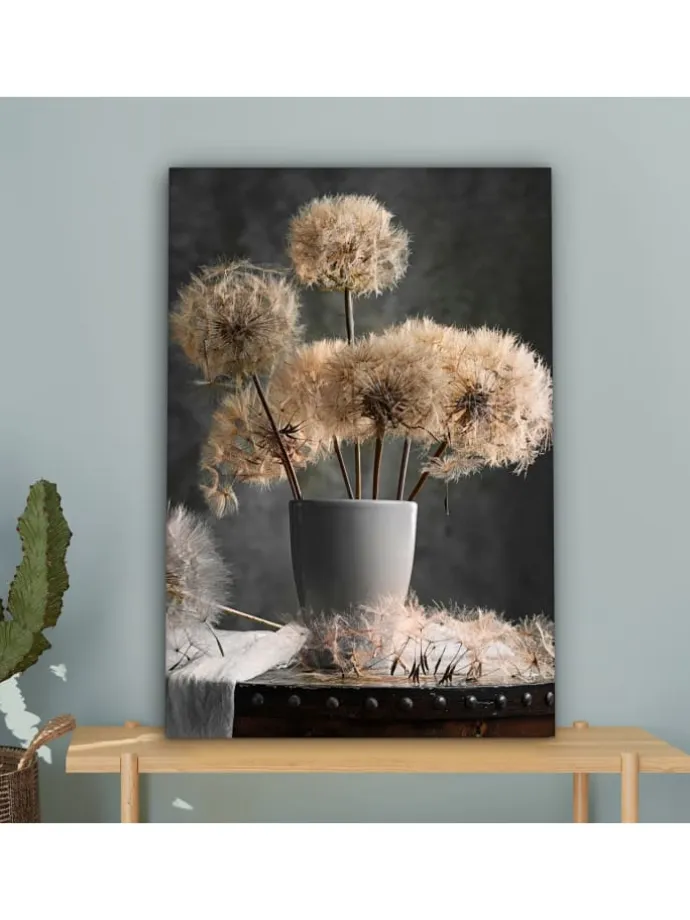 Dieses wunderschöne Gemälde wird in höchster Auflösung auf Leinwand gedruckt. Dies garantiert einen gestochen scharfen, farbechten Druck mit leuchtenden Farben. Die Seiten der Leinwand sind mit einem Beschnitt des Fotos bedruckt. Dadurch passen auch diese Seiten der Leinwand gut zum Foto. Das Foto wird auf robustes, 260 Gramm schweres, 0,41 mm dickes Leinwandgewebe gedruckt. Das Leinengewebe ist straff auf einen zwei Zentimeter dicken Holzkeilrahmen gespannt. Dieser Holzrahmen besteht aus FSC-zertifiziertem Kiefernholz. Das Produkt wird mit einem Standard-Aufhängesystem geliefert, mit dem sich der Druck einfach an der Wand befestigen lässt. Produkteigenschaften In verschiedenen Größen erhältlich Inklusive praktischem Aufhängesystem Auf einen 2 cm dicken Holzrahmen gespannt Wanddekoration passend für Ihr: Schlafzimmer, Wohnzimmer, Kinderzimmer, Büro, Flur, Küche und jeden anderen Raum in Ihrem Zuhause oder Ihren Geschäftsräumen Umfangreiche SammlungMuchoWow verfügt über eine umfangreiche Sammlung wunderschöner Bilder zu verschiedenen Themen.Über das Foto: Stillleben mit Löwenzahnsamen in einer Vase.