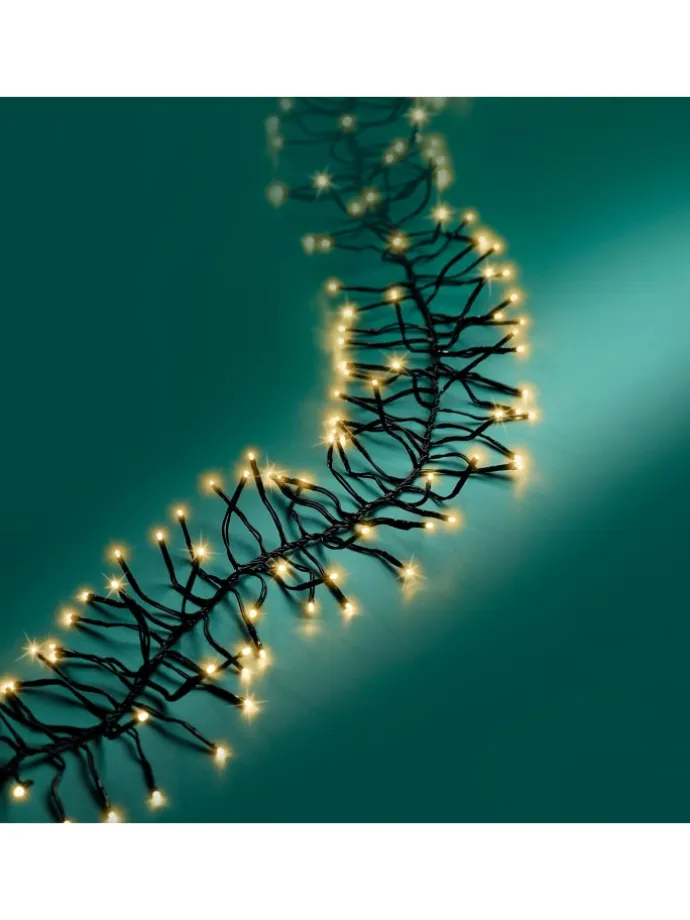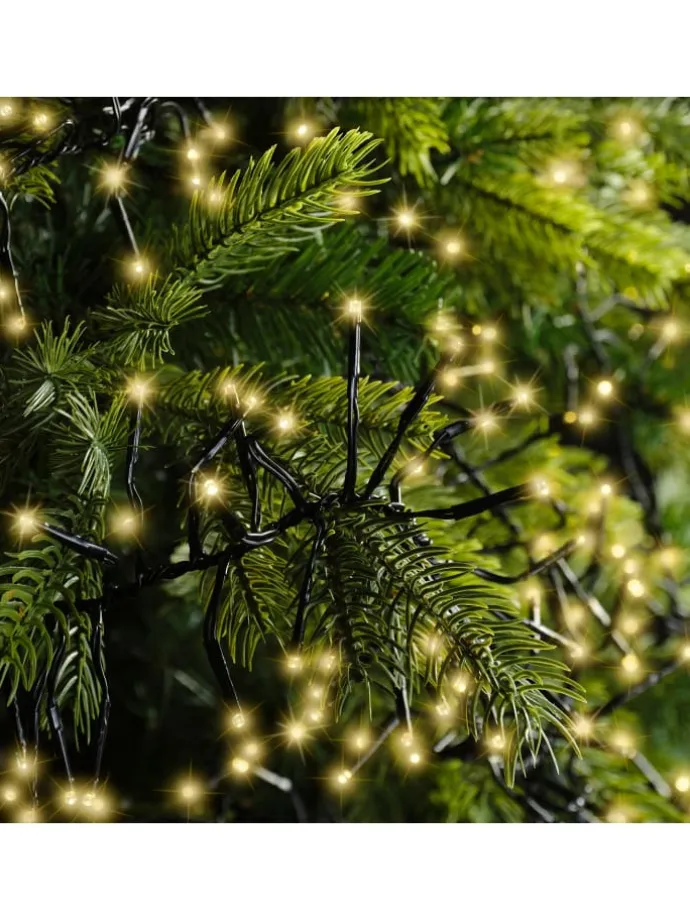 Lumineo Lichterkette CLUSTER 1.512 LED 14 m, Soft Gold Die Lichterkette verfügt über 1.512 LEDs welche in einem soft goldenem Ton erstrahlen. Die 5 Stufen-Dimm-Funktion ermöglicht es, die Helligkeit nach Belieben anzupassen und somit die perfekte Atmosphäre zu schaffen. Dank der praktischen Timer-Funktion lässt sich die Lichterkette ganz bequem steuern, sodass sie automatisch 8 Stunden lang eingeschaltet und 16 Stunden ausgeschaltet ist. Diese Funktion spart nicht nur Energie, sondern sorgt auch dafür, dass die Lichterkette jeden Tag zur gleichen Zeit erstrahlt. Die Beleuchtung bietet zudem eine großzügige 5 m lange Zuleitung, wodurch die LED-Kette eine Gesamtlänge von 19 m besitzt. Mit dem IP44-Schutz ist sie Wetterbeständig und somit gegen Spritzwasser geschützt. Sie ist für den Innen- und Außenbereich geeignet. Für eine Baumhöhe von 150 – 180 cm geeignet. Mit Gütesiegel ausgezeichnet. Das Kabel ist schwarz.
