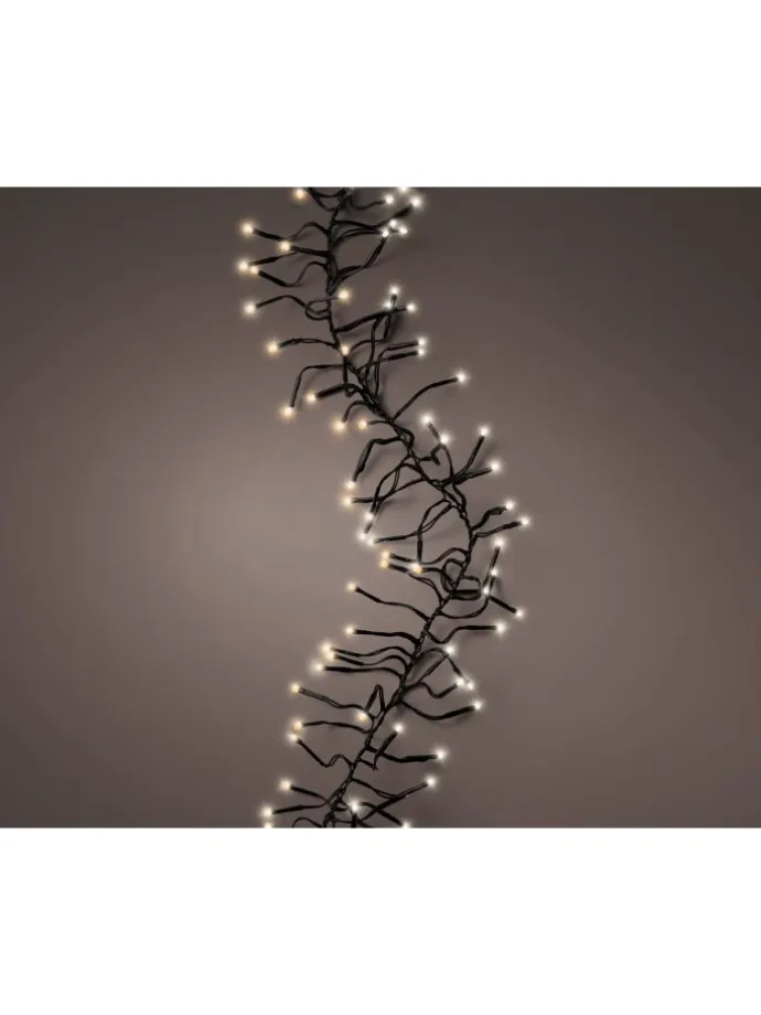 Lumineo Lichterkette CLUSTER 1.512 LED 14 m, 2-farbig Die Lichterkette verfügt über 1.512 LEDs welche in zwei Lichtfarben, warm weiß + klassisch warm, erstrahlen. Die 5 Stufen-Dimm-Funktion ermöglicht es, die Helligkeit nach Belieben anzupassen und somit die perfekte Atmosphäre zu schaffen. Dank der praktischen Timer-Funktion lässt sich die Lichterkette ganz bequem steuern, sodass sie automatisch 8 Stunden lang eingeschaltet und 16 Stunden ausgeschaltet ist. Diese Funktion spart nicht nur Energie, sondern sorgt auch dafür, dass die Lichterkette jeden Tag zur gleichen Zeit erstrahlt. Die Beleuchtung bietet zudem eine großzügige 5 m lange Zuleitung, wodurch die LED-Kette eine Gesamtlänge von 19 m besitzt. Mit dem IP44-Schutz ist sie Wetterbeständig und somit gegen Spritzwasser geschützt. Sie ist für den Innen- und Außenbereich geeignet. Für eine Baumhöhe von 150 – 180 cm geeignet. Die Lichterkette leuchtet in zwei Farbtönen gleichzeitig – diese lassen sich nicht Hin- und Her switchen.