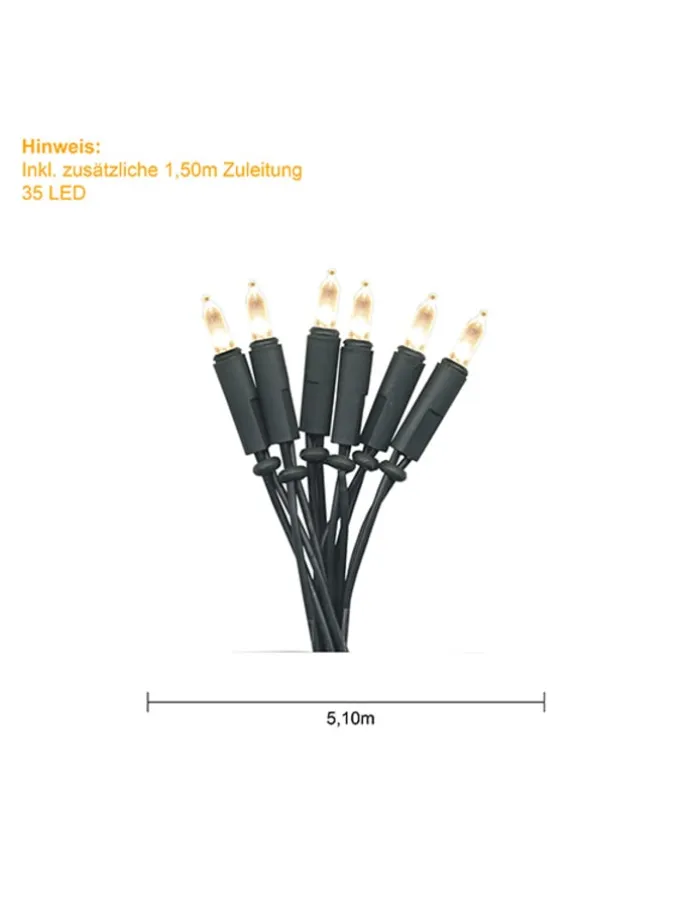 Die Lichterkette ist mit 35 P-LEDs ausgestattet, die in einem gemütlichen, warmweißen Licht strahlen und somit die ideale Atmosphäre für die Feiertage schaffen. Ganz egal ob als funkelnde Dekoration für den Weihnachtsbaum, kunstvoll um das Geländer gewickelt oder über dem Kamin angebracht – die Lichterkette verleiht jedem Zimmer einen besonderen Glanz.