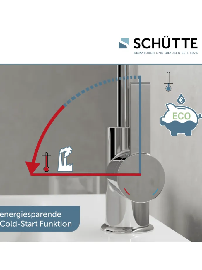 Ressourcenschonend handeln auch im Kleinen? Dann ist diese Einhebel-Mischbatterie mit Cold-Start Technik genau richtig, denn sie gewährt bei senkrechter Position des Bedienhebels nur den Zufluss von Kaltwasser. Bei vielen Waschgängen völlig ausreichend.