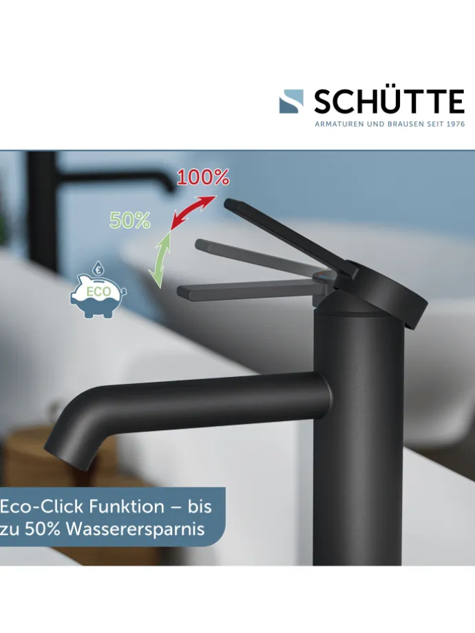 Mit der Eco-Click Funktion – zweistufiger Bedienhebel – kann der Wasserauslauf reduziert werden. Diese Waschtischarmatur spart Wasser, Energie und Geld und leistet einen kleinen Beitrag für die Umwelt.