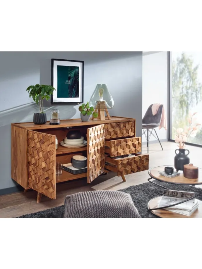 Entdecken Sie unser Sideboard aus Sheesham Massivholz, ein echtes Highlight für jedes Wohnzimmer. Mit den Maßen 138x76x45 cm passt es ideal in verschiedenste Raumkonzepte. Die Kombination aus modernem Design und der Natürlichkeit des Holzes schafft eine warme und einladende Atmosphäre.