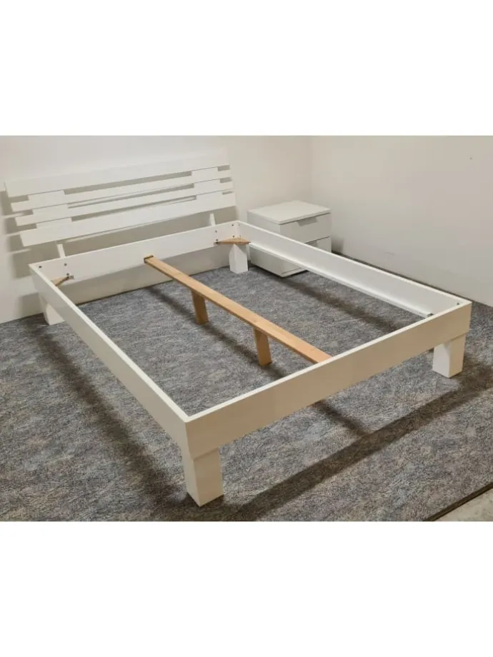 Schönes Massivholzbett in Buche massiv, weiß lackiert in 140 x 200 cm. Das Kopfteil ist durchgehend mit Lamellen versehen und besticht durch seine natürliche Optik.