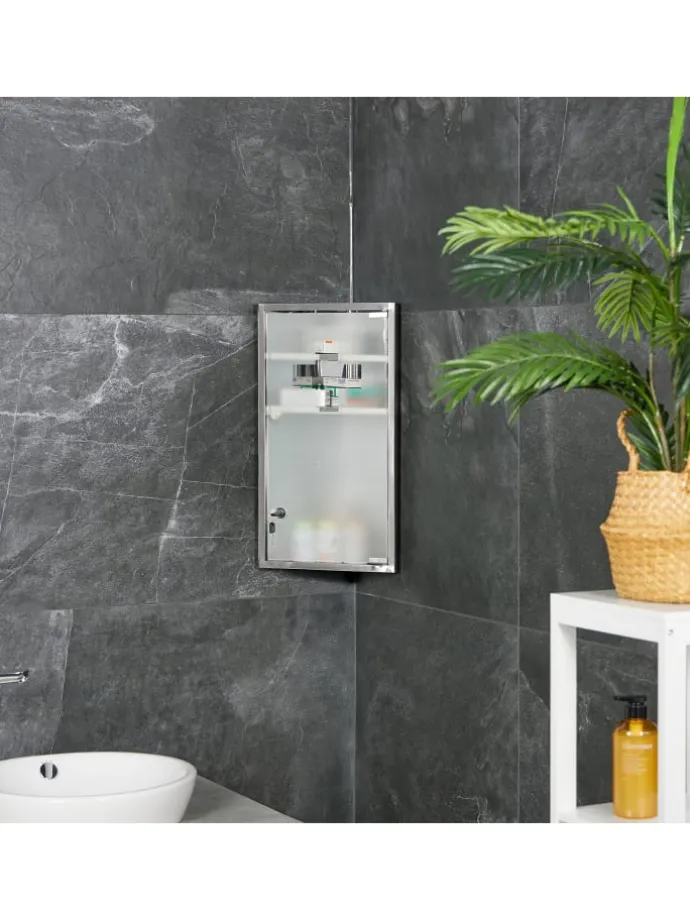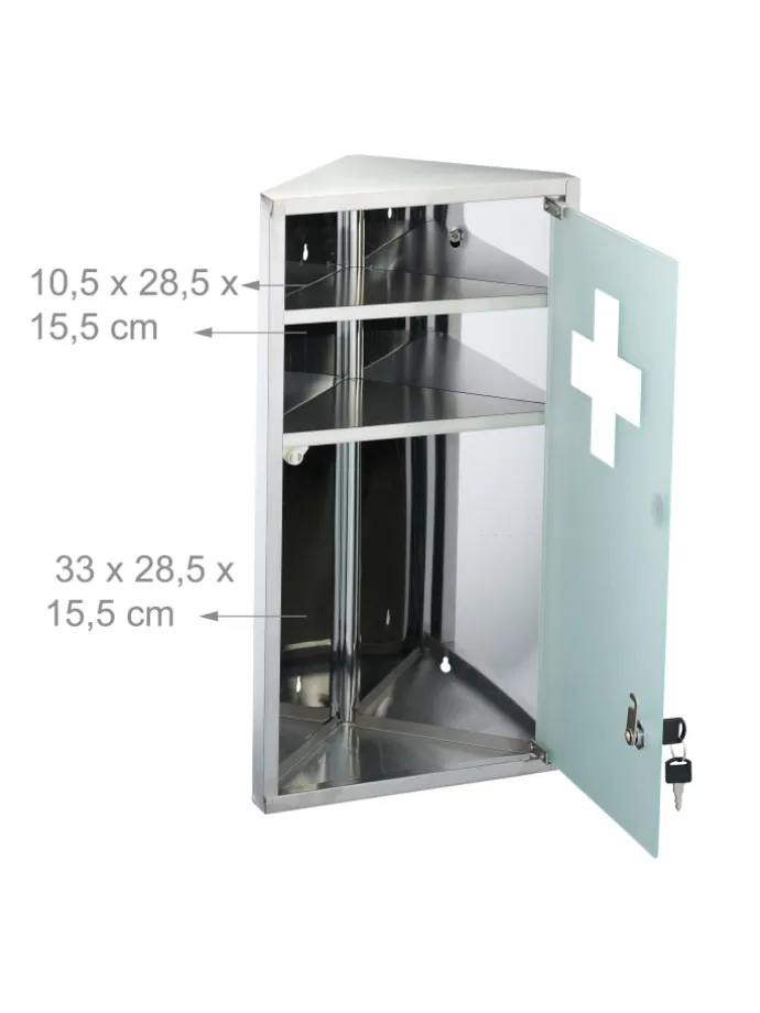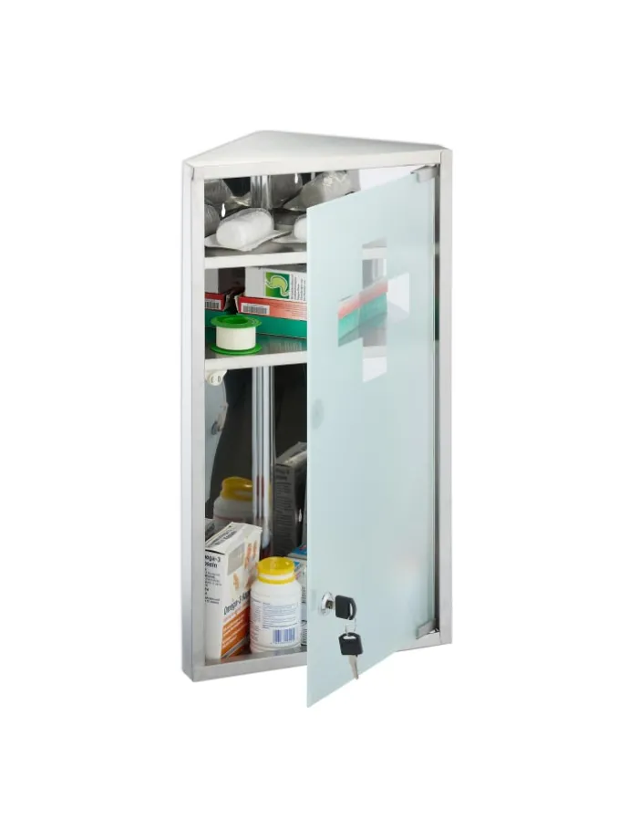 Mit dem Medikamentenschrank für Ecken sorgst Du für Ordnung in Deiner Hausapotheke. Mit seinen 3 Fächern bietet der Arzneimittelschrank ausreichend Platz, um Medikamente, Verbandsmaterial und Erste-Hilfe-Sets ordentlich zu verstauen. Wichtige und bisweilen gefährliche Arzneimittel sind dank der abschließbaren Tür vor neugierigen Kindern und Unbefugten geschützt. Der Hausapothekenschrank überzeugt mit seinem modernen Materialmix aus Edelstahl und Milchglas.