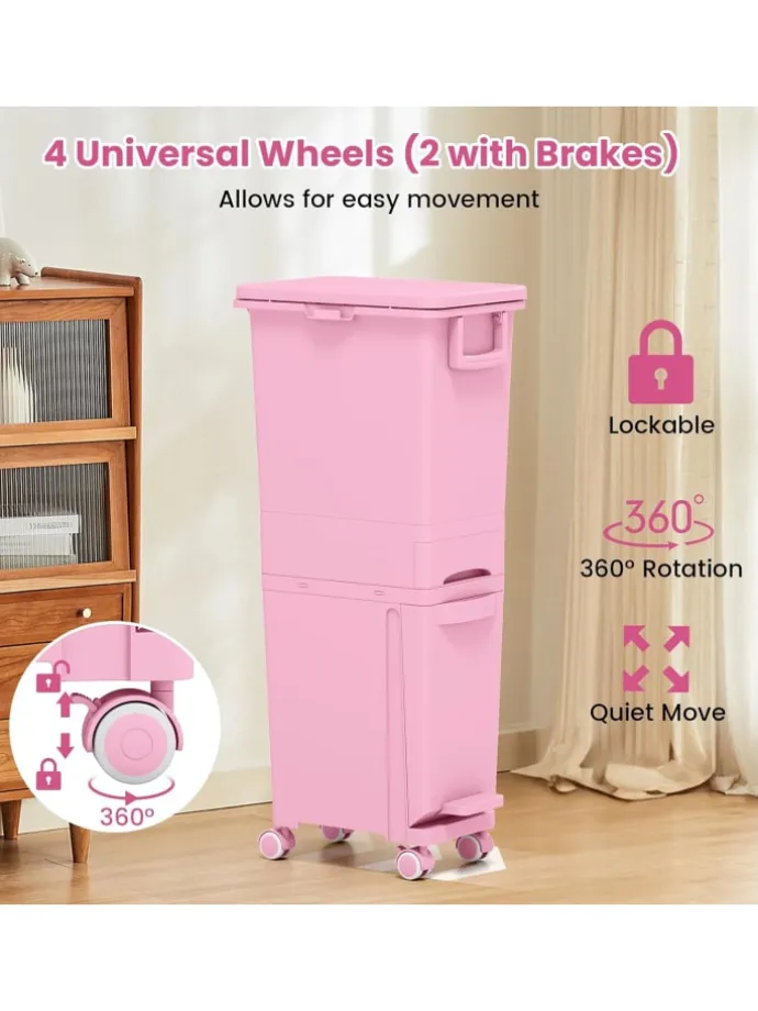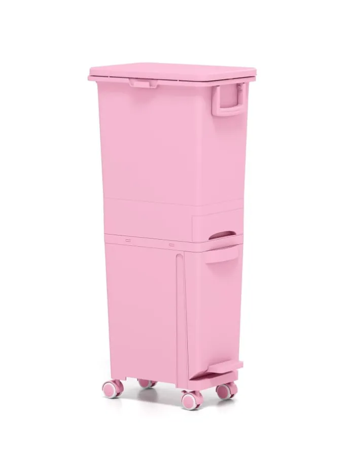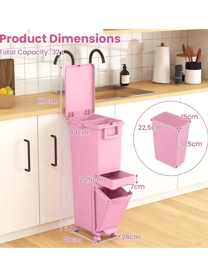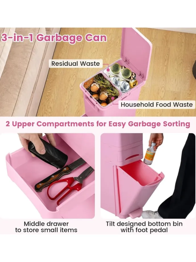 Unser vielseitiger 3-in-1 Küchenabfalleimer ist die ideale Lösung für Ihre Müllentsorgung. Er verfügt über 2 oberen Fächer für einfache Mülltrennung, einen neigbaren unteren Behälter mit Fußpedal und eine praktische mittlere Schublade für kleine Gegenstände. Mit einem erhöhten Design, das das Bücken vermeidet, und 4 Universalrädern (2 mit Bremsen) für einfache Bewegung bietet dieser Mülleimer alles, was Sie brauchen. Aus hochwertigem PP-Material gefertigt, ist er langlebig und für den häuslichen Gebrauch bestens geeignet. Das schlanke Design passt perfekt in kleine Räume wie Wohnzimmer, Küche oder Esszimmer.