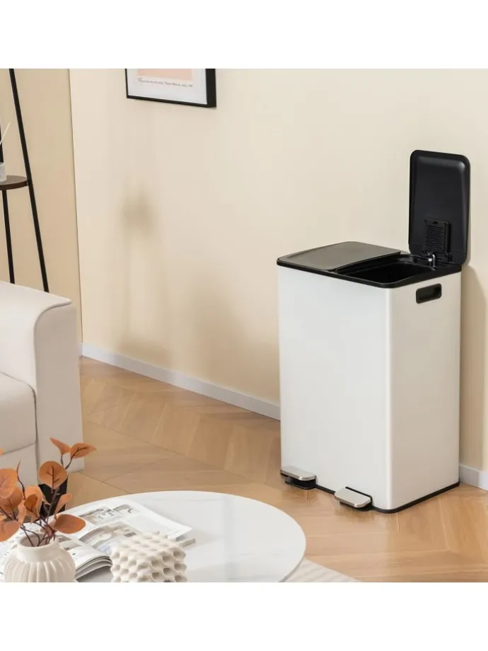 Mit seinen zwei Fächern und einem satten Fassungsvermögen von 60 l ist der Mülleimer ein Superstar beim Sortieren von Wertstoffen und Lebensmittelabfällen. Die versiegelten Deckel schließen unangenehme Gerüche ein, während zwei Deodorant-Fächer Deodorants (nicht im Lieferumfang enthalten) enthalten, um seltsame Gerüche zu vermeiden. Und das Beste: Dank der 2 herausnehmbaren Behälter ist der Austausch der Müllbeutel ein Kinderspiel. Dieser Mülleimer ist tragbar und verfügt über seitliche Griffe.