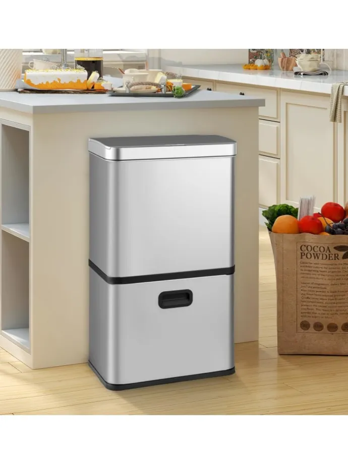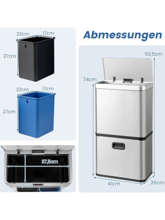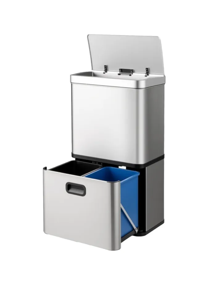 Der elegante Edelstahl-Mülleimer ist mit einer Bewegungssensorik ausgestattet, die eine berührungslose Bedienung und einfache Abfallentsorgung ermöglicht. Der Sensor reagiert innerhalb von 0,2 s und schaltet sich nach 5 s automatisch ab, bei einem Erfassungsbereich von 15 cm. Er benötigt 4 C-Batterien (nicht enthalten). Dieser effiziente Mülleimer hat ein großes Fassungsvermögen von 56 L, mit einem 36 L Fach im oberen Teil und zwei 10 L Behältern im unteren Teil für eine effiziente Mülltrennung. Der Deckel lässt sich in einem Winkel von 85° öffnen, um eine Kollision mit den Wänden zu vermeiden und eine einfache Reinigung zu gewährleisten, während ein Dämpfungsmechanismus für einen leisen und sicheren Betrieb sorgt. Das Mülltrennsystem ist außerdem mit einer praktischen Drucktastensteuerung zum manuellen Öffnen und Schließen ausgestattet.